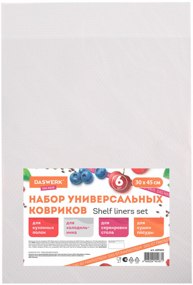 Набор универсальных ковриков Daswerk обеспечит надежную защиту поверхностей от влаги, жира, пятен, а также от царапин, сколов и других механических повреждений. Коврики Daswerk станут незаменимым аксессуаром в доме и на даче! Набор универсальных хозяйственных ковриков Daswerk включает шесть прямоугольных ковриков размером 30×45 см. Эти коврики станут незаменимыми в доме и на даче, обеспечивая защиту любых поверхностей от влаги, жира, пятен, а также от царапин и других механических повреждений.
