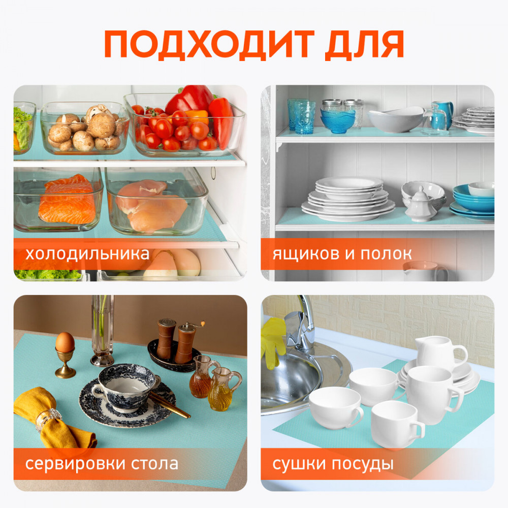 Главное достоинство ковриков — их многофункциональность: вы сможете использовать их для полок холодильника, выдвижных ящиков, эстетичной сервировки стола в качестве плейсматов, сушки посуды и полок для обуви. Коврики можно постелить на подоконник под горшки с комнатными растениями или обустроить зону кормления домашних питомцев, что значительно упростит уборку. Кроме того, коврики легко нарезаются ножницами, позволяя создать фрагменты нужного размера и формы.