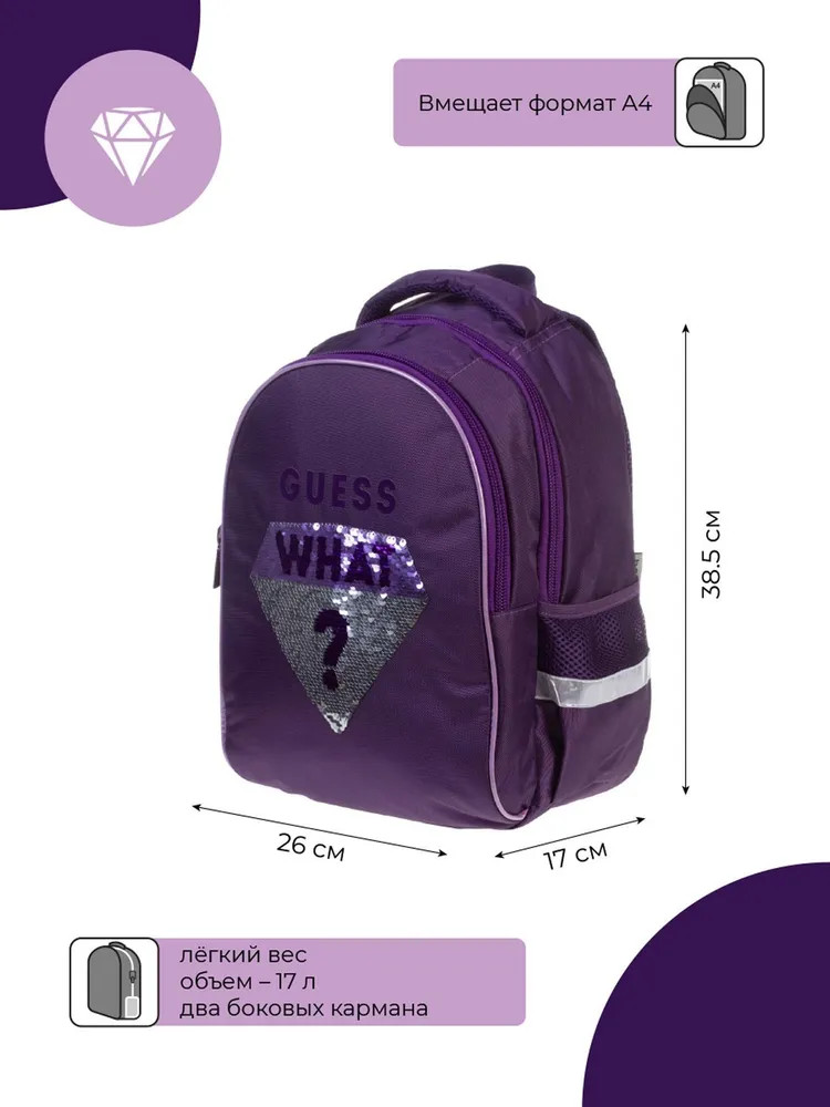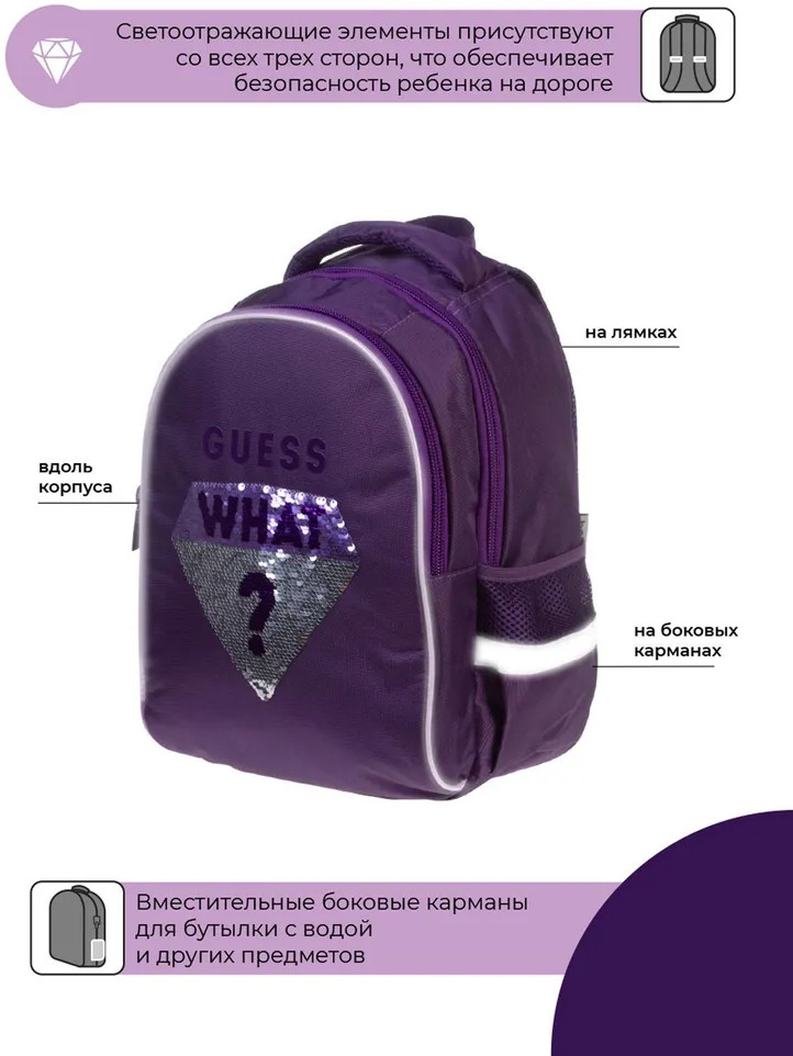 Hatber Рюкзак «What?»В данный момент этот товар отсутствует в продаже. Возможно, у нас найдется аналогичный или похожий товар здесь. Серия: Primary school Предназначен для начальной школы. Размер 26×17×38,5 см. Объем 17 л. Рюкзак является достойной альтернативой дорогостоящему ранцу. Выполнен из высококачественного нейлона. Эргономичная вентилируемая спинка с мягкими вставками, регулируемые лямки, усиленное дно, светоотражающие элементы, крупные удобные молнии, мягкая ручка для переноса и ручка-петля для подвеса. Нагрудная стяжка позволит плотно закрепить ранец на спине школьника. Два вместительных отделения, внутри основного — карман-перегородка, во втором отделении — функциональный органайзер, включающий два кармана на молнии для мелочей и мобильного телефона, отстегивающийся карабин для ключей. Боковые карманы для бутылки с водой или термоса. На спинке имеется потайной карман на молнии — необходимая опция для каждого школьника. Светоотражающие элементы на лямках, передней и боковых частях рюкзака обеспечивают безопасность ребенка на дороге. Печать по ткани. Аппликация с пайетками. |