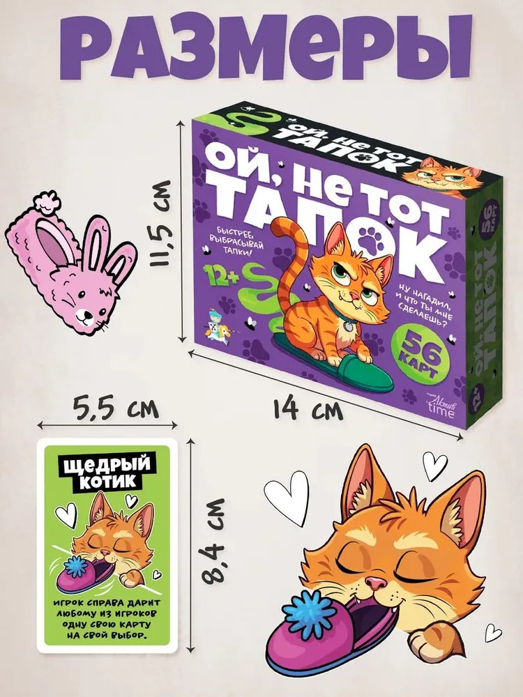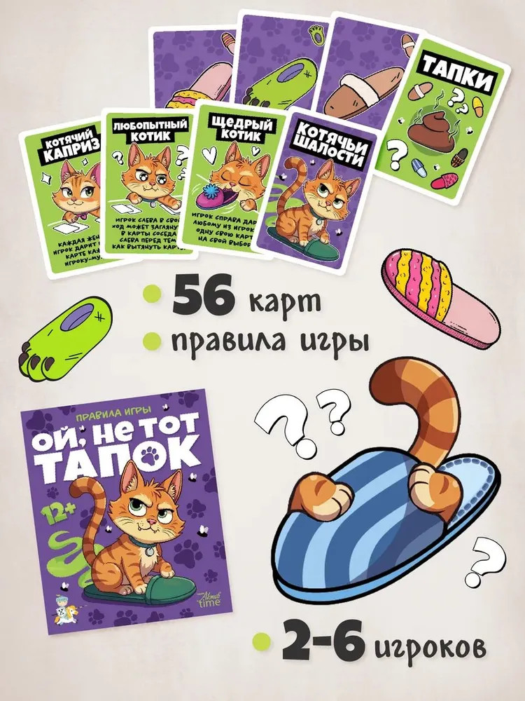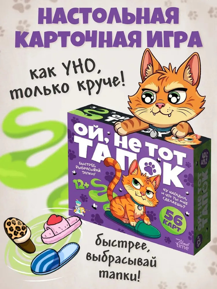 💳 Оплатить за товар можно при получении 🇰🇿 Есть бесплатная доставка по Казахстану от 1 дня 🎁 Копите бонусы с каждой покупки Серия: Актив time Настольная игра «Ой, не тот тапок» — это азартная и весёлая игра, в которой вам предстоит ловко избавляться от карт. Котик заскучал и устроил хаос! По всему дому разбросаны тапки, потерявшие свои пары, а один из них превратился в тот самый проблемный тапок ... Кто останется с этим подарком? Проверь свою удачу и ловкость! Настольная игра «Ой, не тот тапок»- развивает внимательность, скорость реакции и умение предугадывать действия соперников, но главное — она создаёт атмосферу веселья и лёгкого хаоса. Идеально для шумных компаний, семейных вечеров и тех, кто любит динамичные и непредсказуемые игры. |