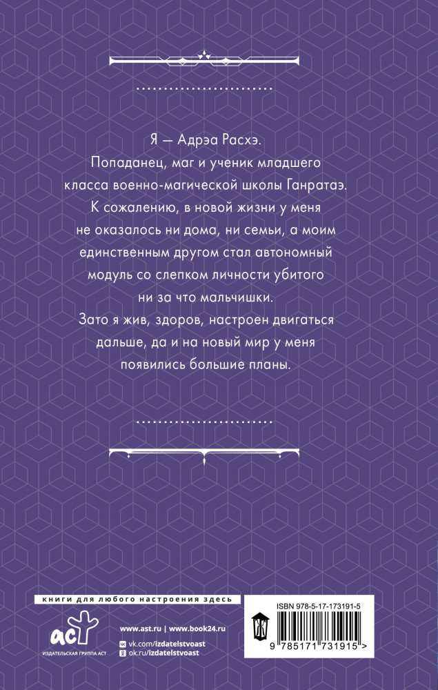 💳 Оплатить за товар можно при получении 🇰🇿 Есть бесплатная доставка по Казахстану от 1 дня 🎁 Копите бонусы с каждой покупки Серия: Фантастические миры Александры Лисиной Я — Адрэа Расхэ. Попаданец, маг и ученик младшего класса военно-магической школы Ганратаэ. К сожалению, в новой жизни у меня не оказалось ни дома, ни семьи, а моим единственным другом стал автономный модуль со слепком личности убитого ни за что мальчишки. Зато я жив, здоров, настроен двигаться дальше, да и на новый мир у меня появились большие планы. |