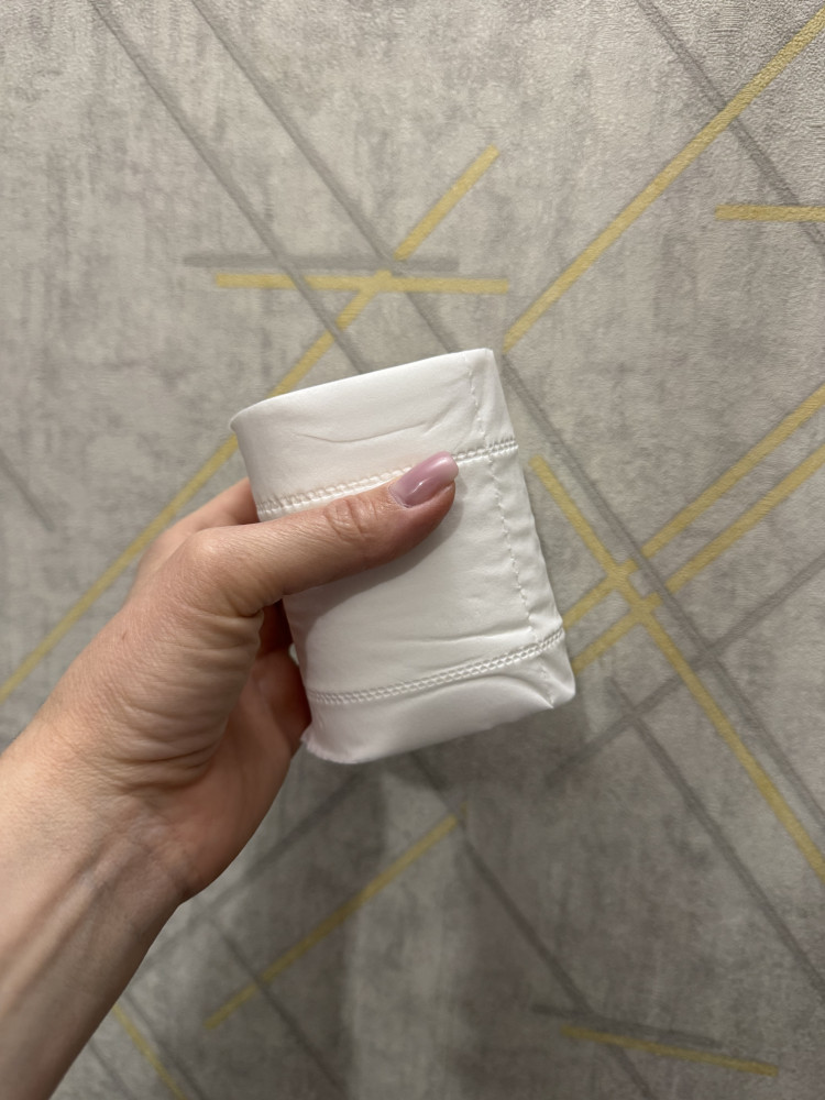Плотная, но при этом мягкая. Можно использовать, как одноразовые бумажные платочки, не размокают и не прилипают.