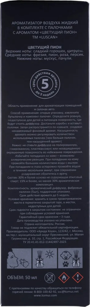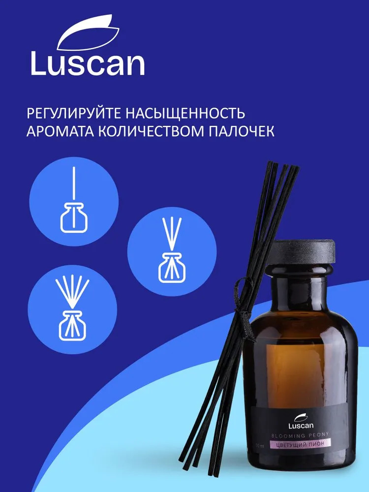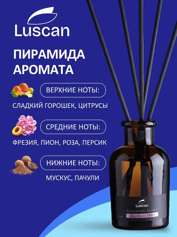 Одной из важных составляющих уюта в доме считается аромат. Аромадиффузор с палочками Luscan Цветущий пион — это самый простой, изящный, эффективный и долговременный способ ароматизации пространства, набирающий свою популярность во всем мире день ото дня. Диффузор представляет их себя небольшую бутылочку, в которую вставляются специальные палочки. Насыщаясь жидкостью в бутылочке, они начинают распространять приятный аромат. Объем: 50 мл. Срок действия: до 5 недель. Срок годности в закрытом состоянии не ограничен.