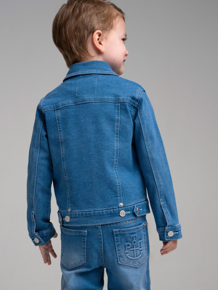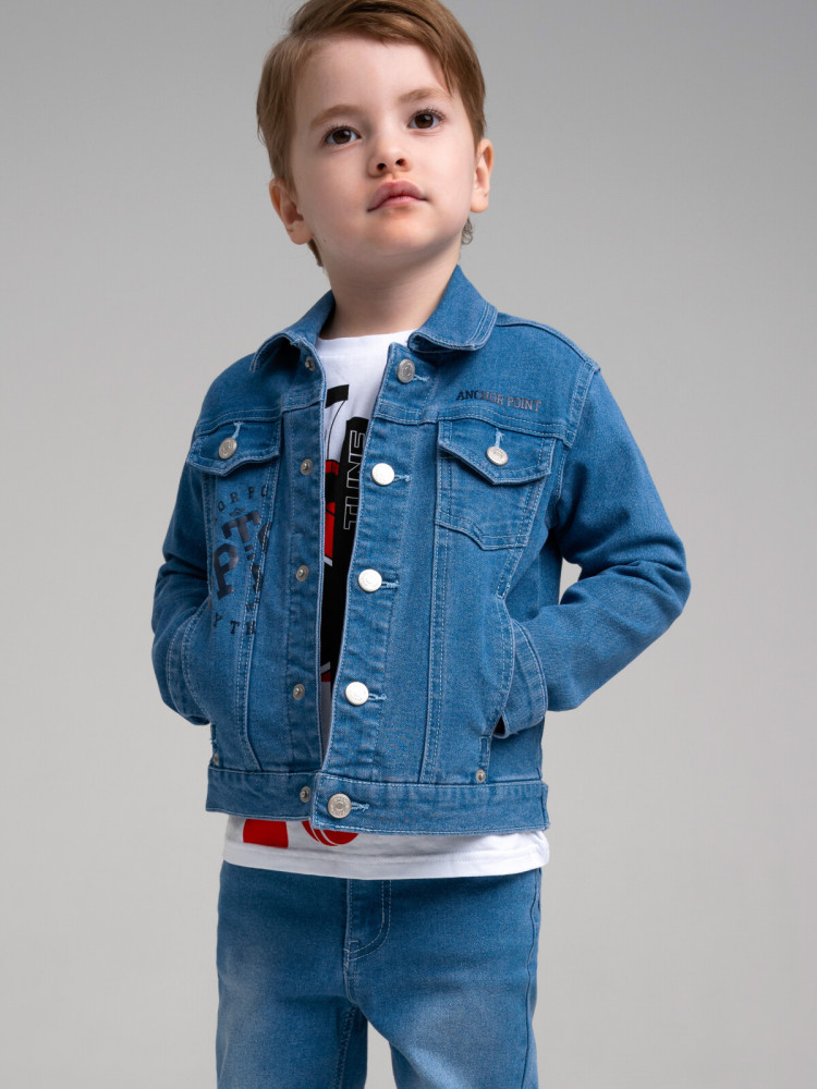 Джинсовка детская для мальчика. Куртка джинсовая из эластичного денима. Ширина низа изделия регулируется. Функциональные нагрудные и боковые карманы. Средняя длина. Застежка на кнопки.