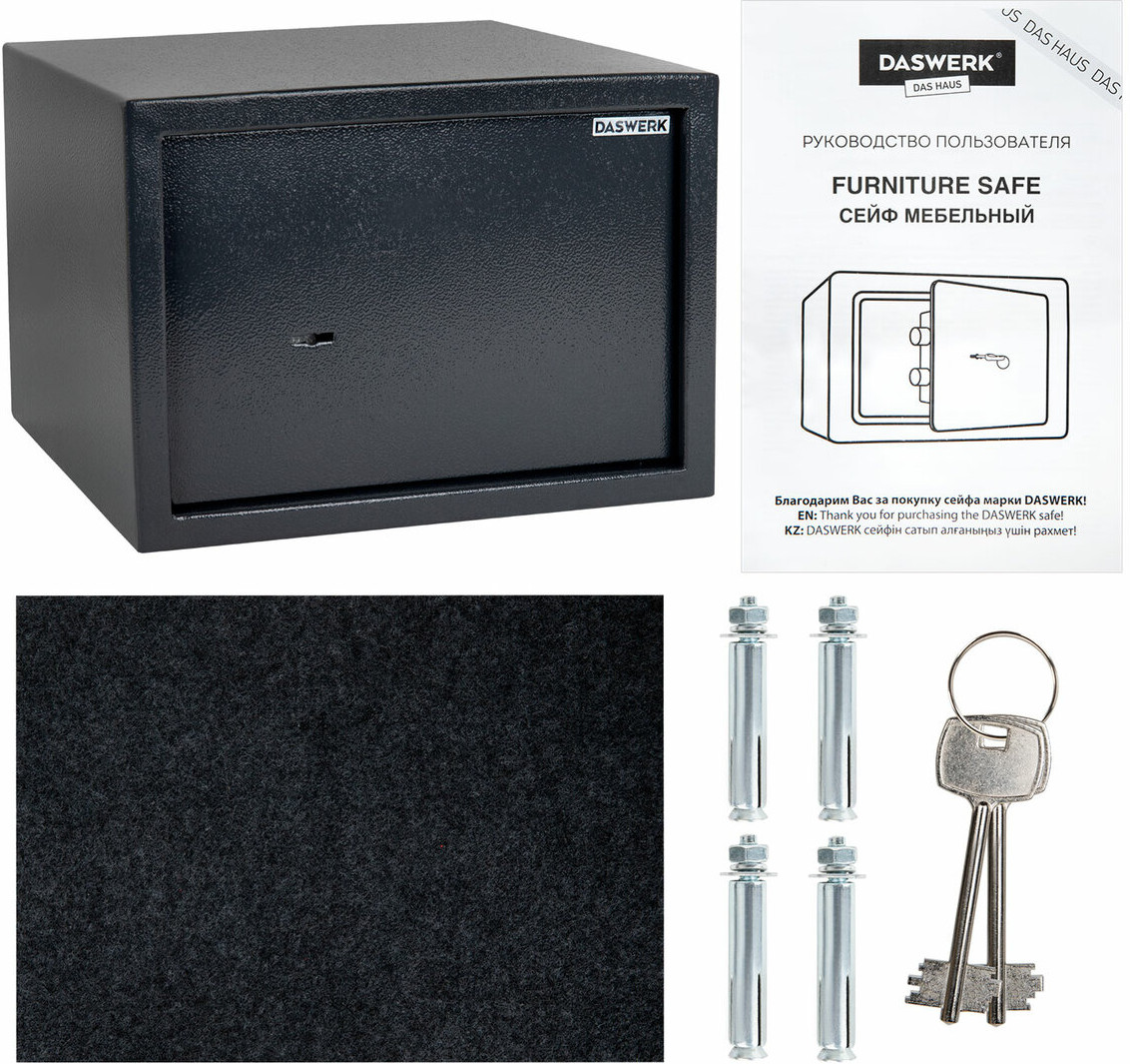 Окраска — стойкое полимерное порошковое покрытие, защищающее от царапин и ржавчин. Конструкция мебельного сейфа Daswerk «SС» предусматривает возможность установки и крепления сейфа внутри мебели, а также анкерное крепление к стене. Сейф Daswerk — это надежное и компактное решение для хранения важных документов и ценностей. Закажите его прямо сейчас!