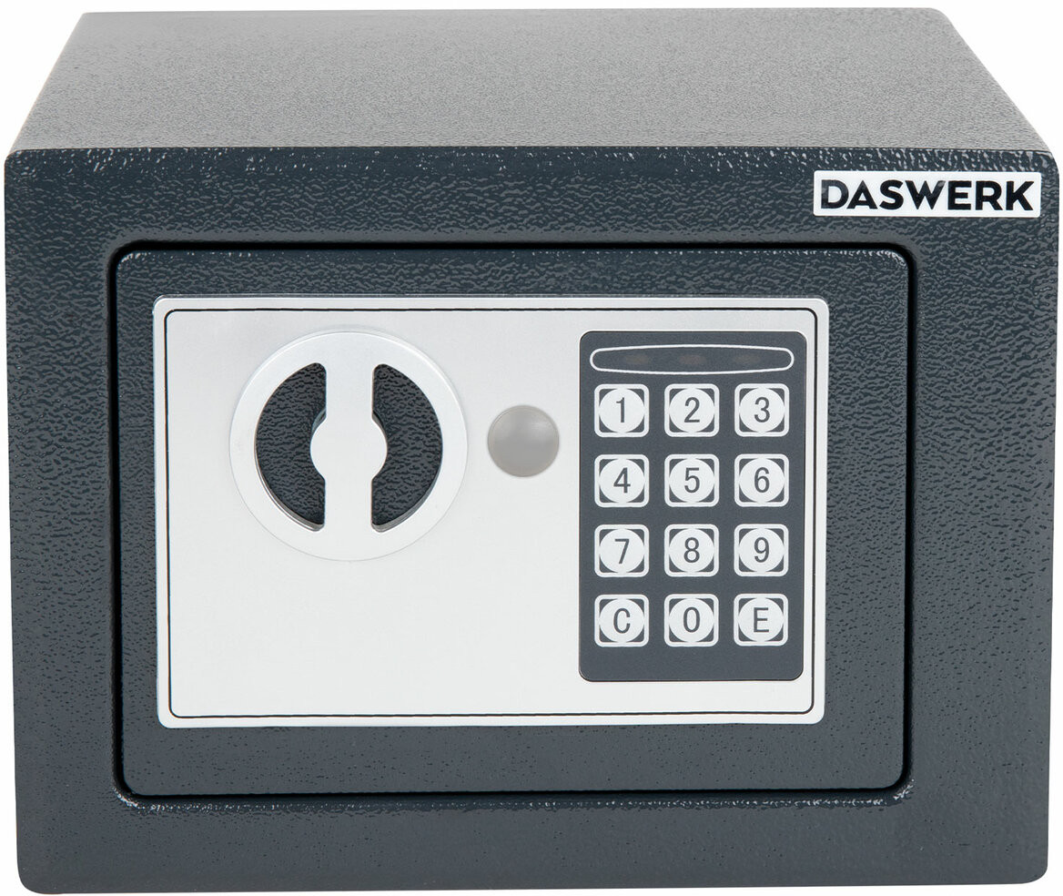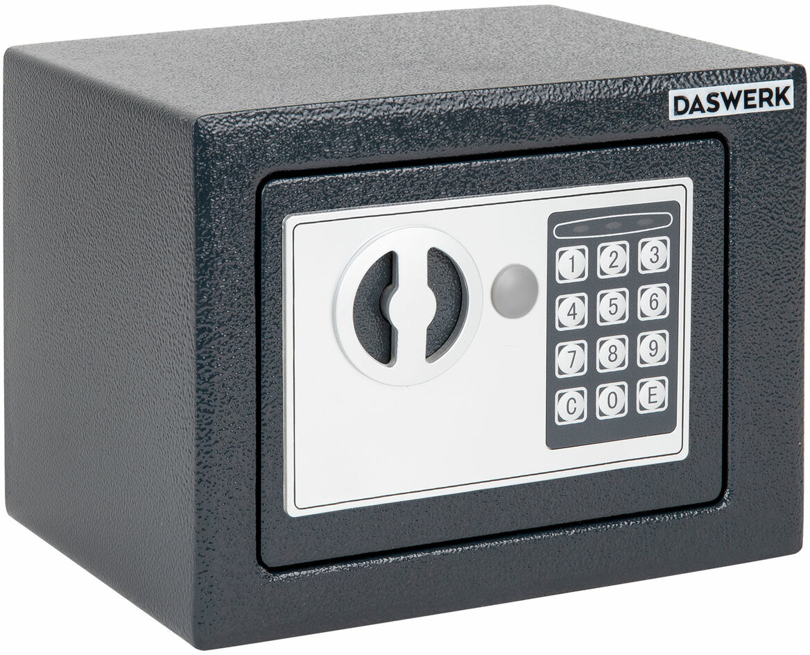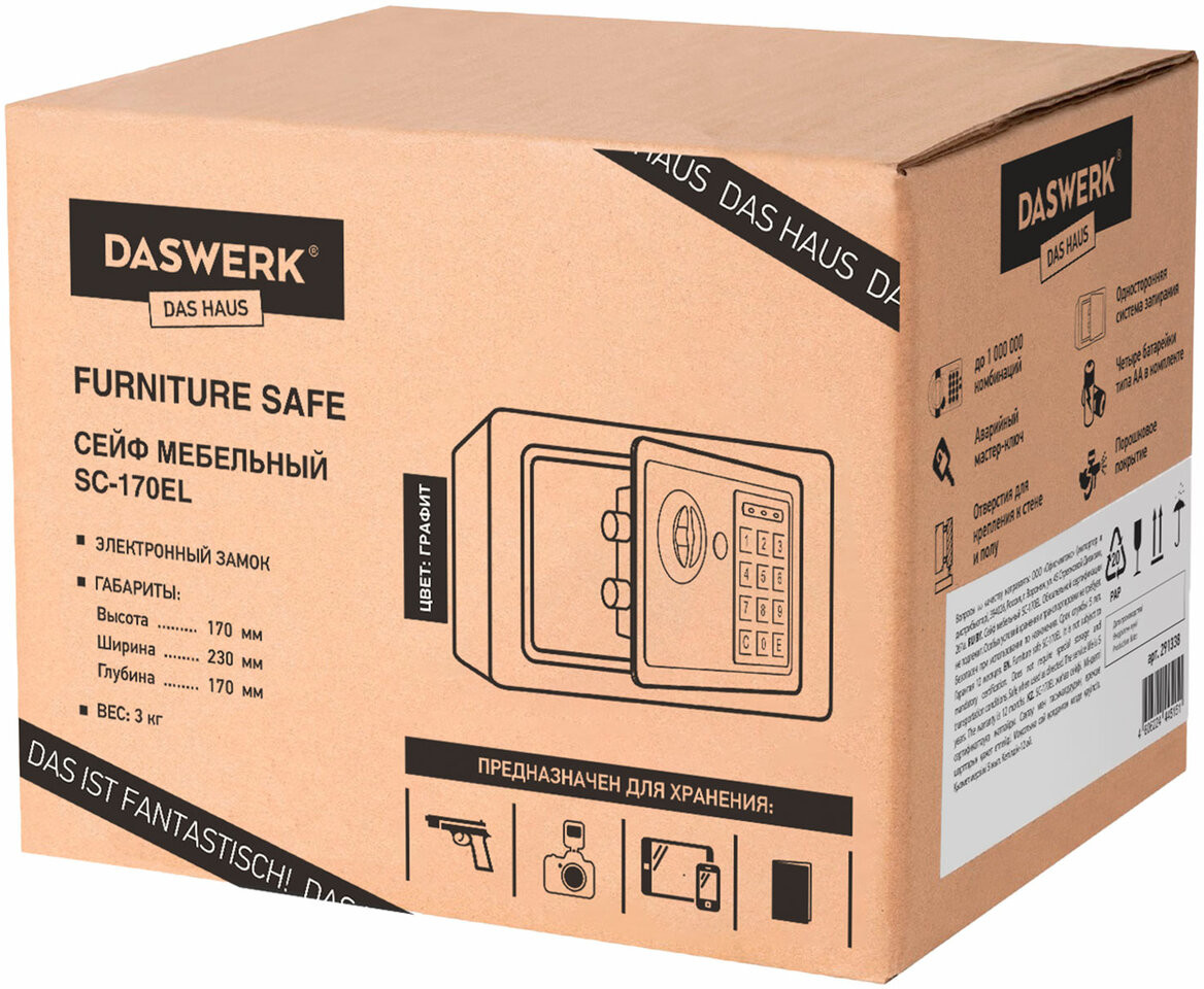 Мебельные сейфы Daswerk серии «SC» предназначены для хранения мелких ценных вещей, документов и личных вещей. Могут использоваться как в офисе, так и дома. Сейф изготовлен из стали. Лицевая панель толщиной 3 мм, боковые — 1.5 мм. На сейф установлен электронный кодовый замок со световой и звуковой индикацией, позволяющий запрограммировать свой уникальный код (от 4 до 8 знаков). В комплект входит аварийный мастер-ключ на случай, если забыли код или вышли из строя элементы питания. Подробная инструкция по эксплуатации замка в комплекте.