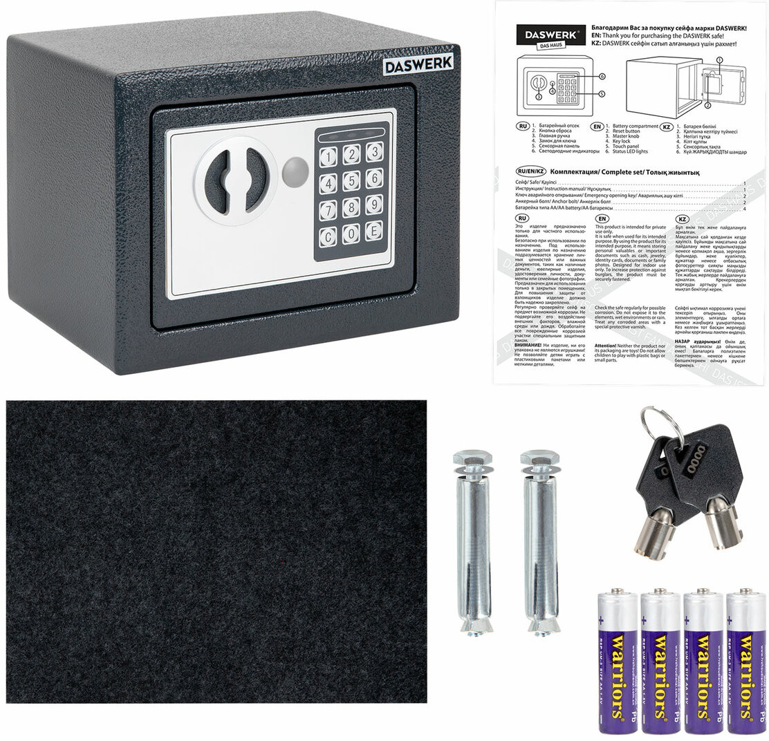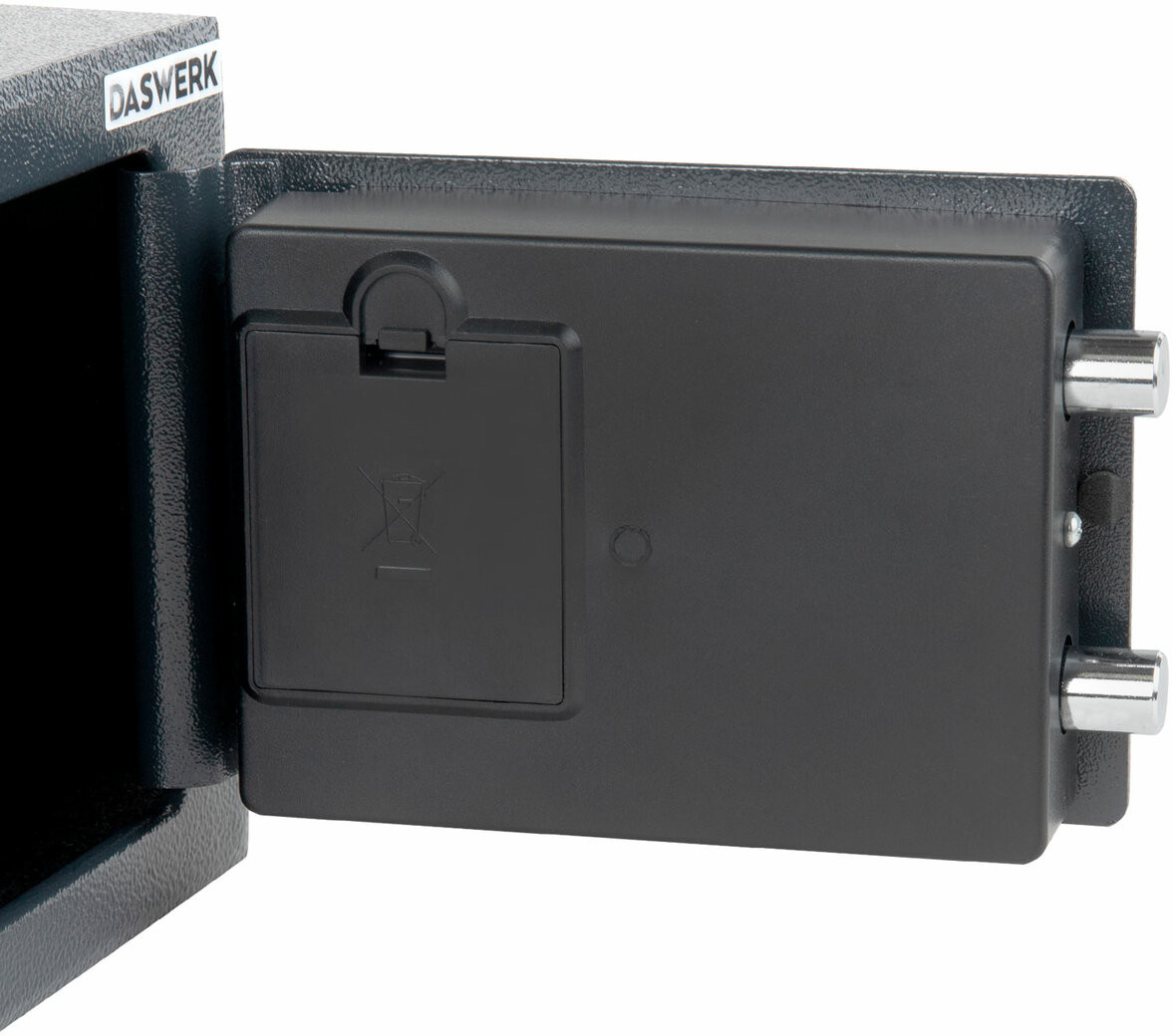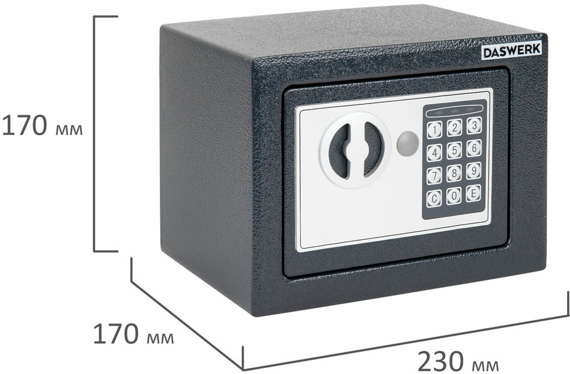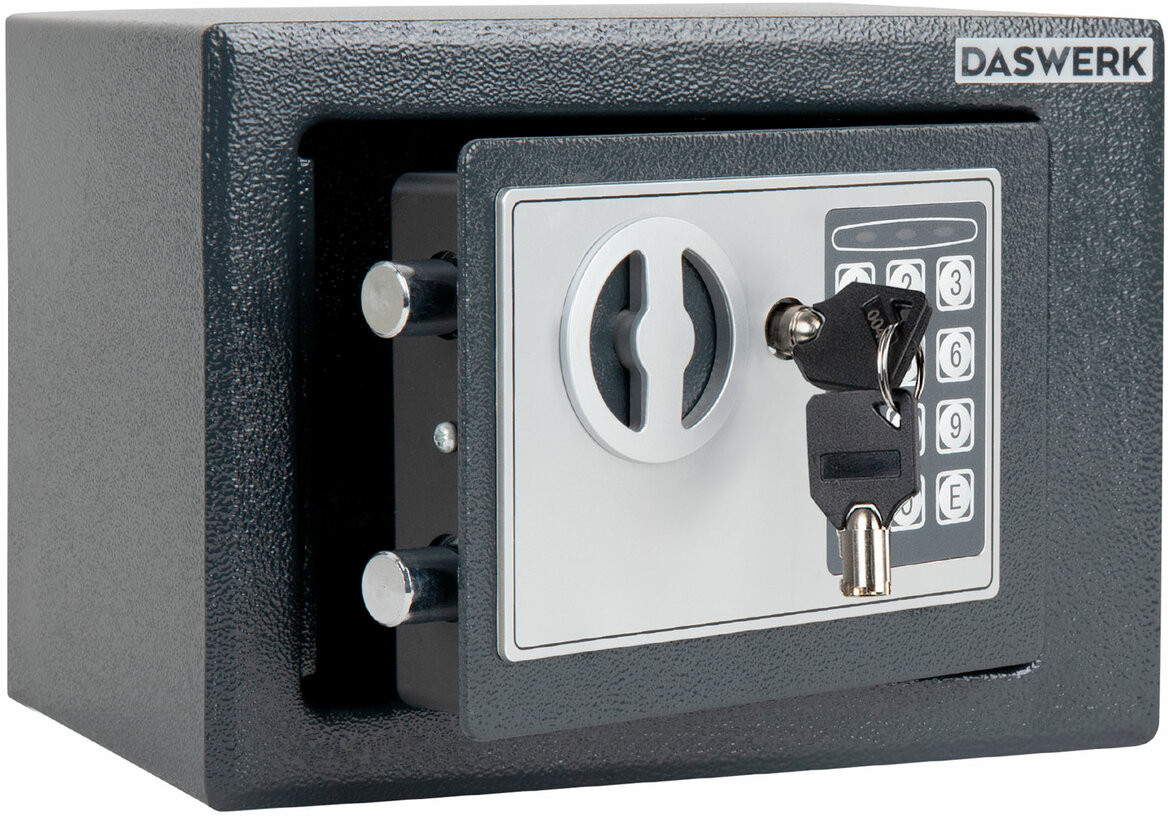 Мебельные сейфы Daswerk серии «SC» предназначены для хранения мелких ценных вещей, документов и личных вещей. Могут использоваться как в офисе, так и дома. Сейф изготовлен из стали. Лицевая панель толщиной 3 мм, боковые — 1.5 мм. На сейф установлен электронный кодовый замок со световой и звуковой индикацией, позволяющий запрограммировать свой уникальный код (от 4 до 8 знаков). В комплект входит аварийный мастер-ключ на случай, если забыли код или вышли из строя элементы питания. Подробная инструкция по эксплуатации замка в комплекте.
