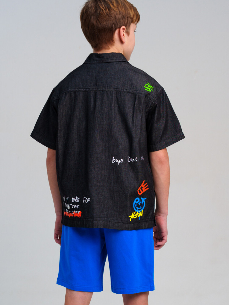 Джинсовая рубашка для мальчика подростка. Оверсайз силуэт. Застежка на кнопки. Функциональный нагрудный карман. Модель выполнена из качественного и плотного текстиля.