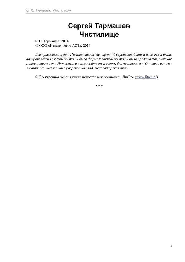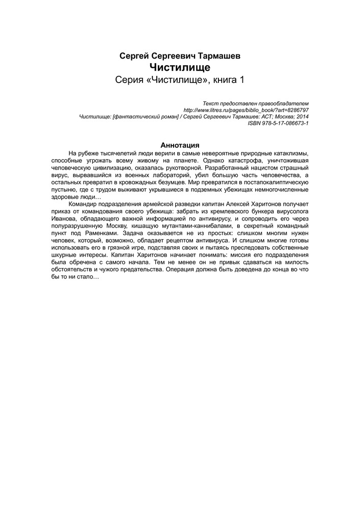 ЧистилищеВ данный момент этот товар отсутствует в продаже. Возможно, у нас найдется аналогичный или похожий товар здесь. Серия: Чистилище (проект Сергея Тармашева) «Чистилище» - совершенно новый цикл, созданный автором легендарных циклов «Древний», «Наследие» и «Ареал» Сергеем Тармашевым. После завершения серии «Тьма», написанной в непривычном для себя жанре фэнтези, Тармашев возвращается к привычному и излюбленному для себя жанру постапокалиптического боевика. «Чистилище» - это только первая книга цикла, в которую, помимо произведений самого Сергея Тармашева, войдут романы и других писателей! |