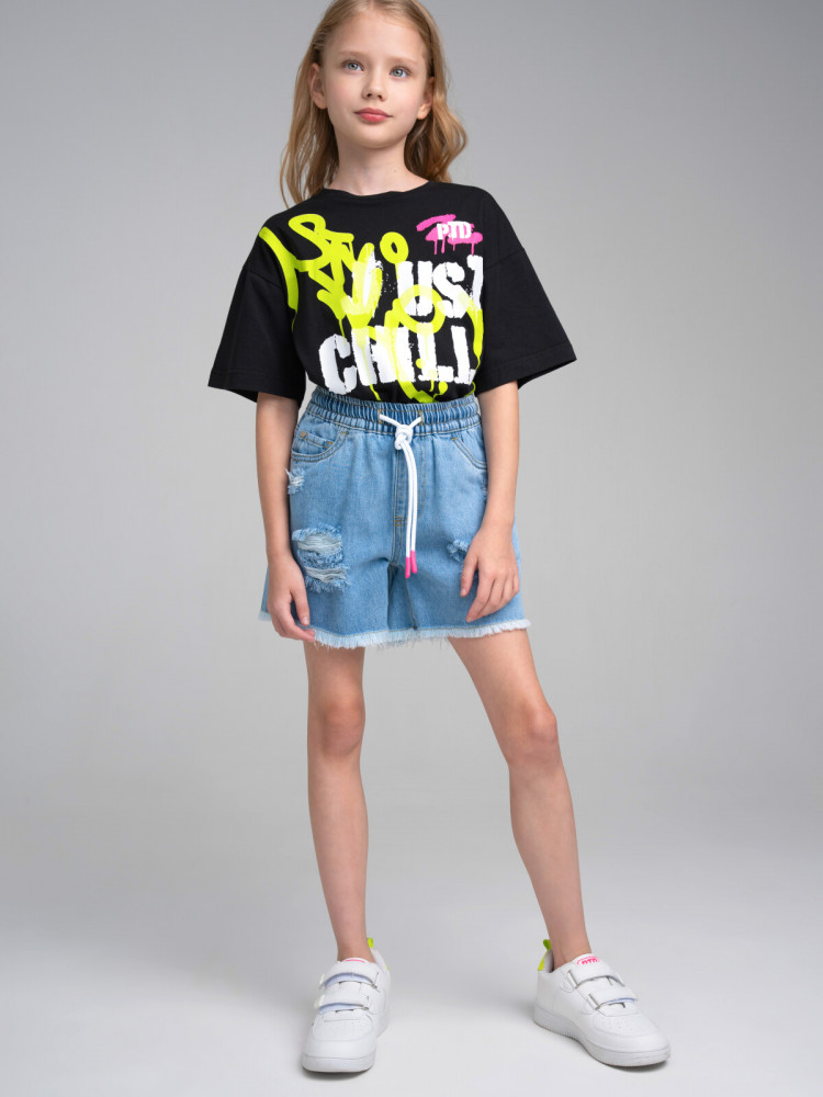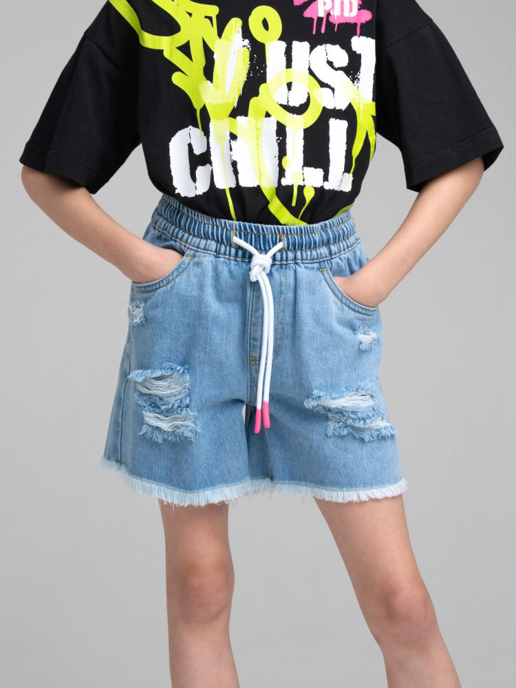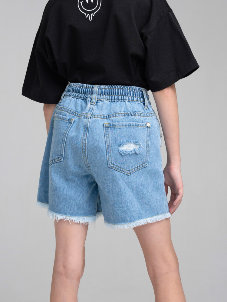Джинсовые шорты для девочки подростка. Шорты свободного силуэта на резинке со шнурком. Функциональные карманы. Трендовые элементы потертости и дыры. Неподшитый низ. Модель выполнена из качественного и плотного текстиля.