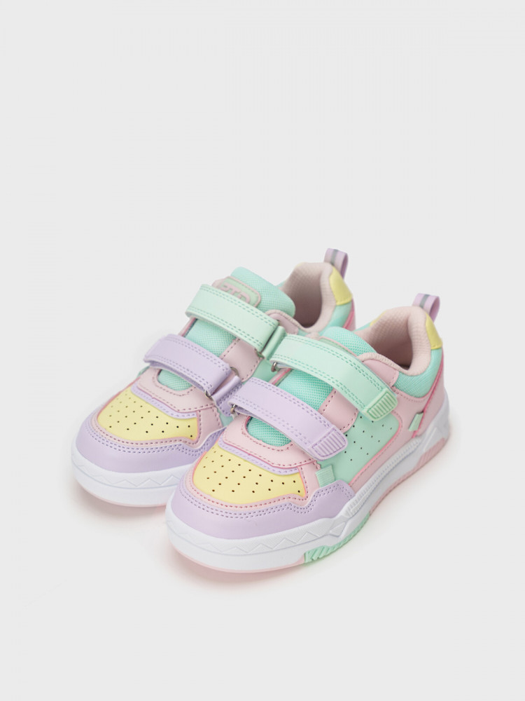Трендовые детские кеды для девочки в стиле колор-блок. Кроссовки выполнены из искусственной кожи, обладающей высокими эксплуатационными свойствами, и текстиля в качестве отделки. Профилированная съемная стелька из свиной кожи с анатомической формой подсводника обеспечивает правильную нагрузку на стопу. В носочной части обуви стоит текстильная подкладка c высоким содержанием хлопка 80%, которая обладает высокой гигроскопичностью. В пяточной части обуви текстильная подкладка обладает хорошей износостойкостью. Две липучки создают удобство при обувании и надежно фиксируют ногу. Формоустойчивый задник поддерживает стопу в правильном положении. Эргономичная форма колодки обеспечивает правильное формирование стопы ребенка. Подошва из ТПР не скользит и устойчива к истиранию.
