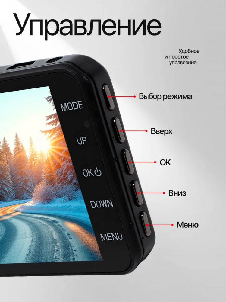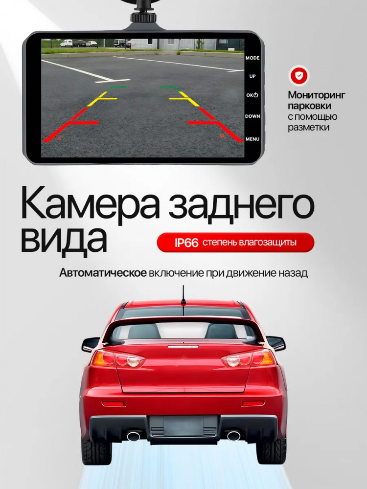 С 4-дюймовым дисплеем, отображающим актуальную дату и время, и меню на русском языке, работать с этим устройством легко и удобно. G-сенсор автоматически фиксирует случаи ДТП при ударах, сохраняя важные моменты. Парковочная камера с водонепроницаемой защитой IP66 не подвержена влиянию неблагоприятных погодных условий — ни снег, ни дождь не помешают её работе.