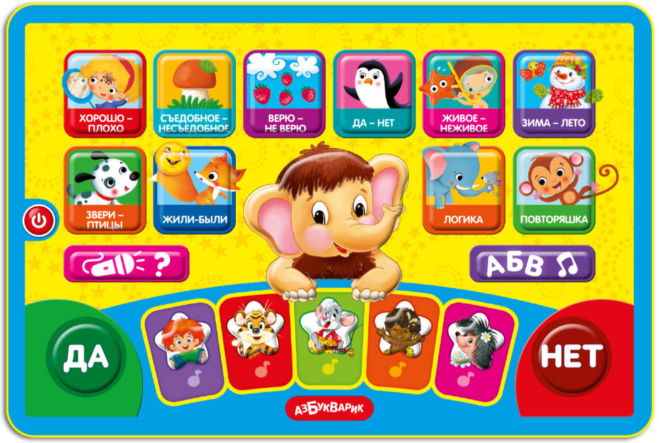 Отвечая на вопросы с помощью кнопок «Да» и «Нет», ребёнок узнает много интересного об окружающем мире. А если он вдруг устанет, то любимые песенки из мультфильмов («Антошка», «По дороге с облаками», «Чунга-Чанга», и другие) надолго зарядят его энергией и позитивом. А после — снова предлагаем сыграть. Например, в «Угадай песенку».