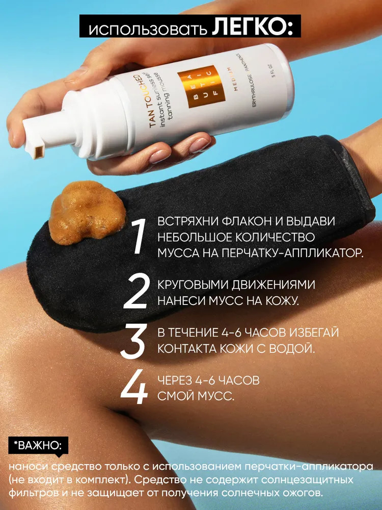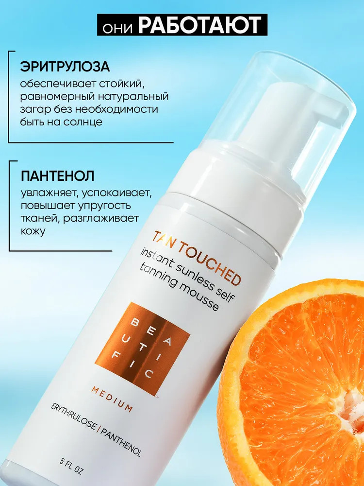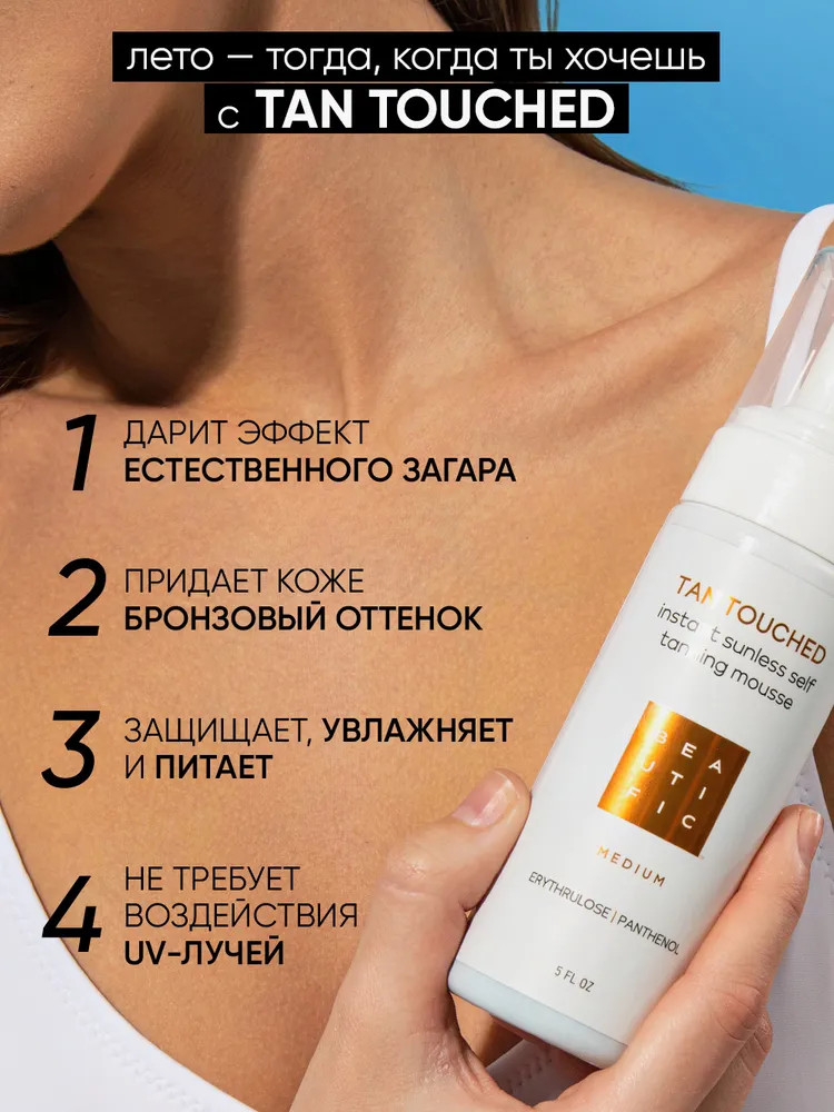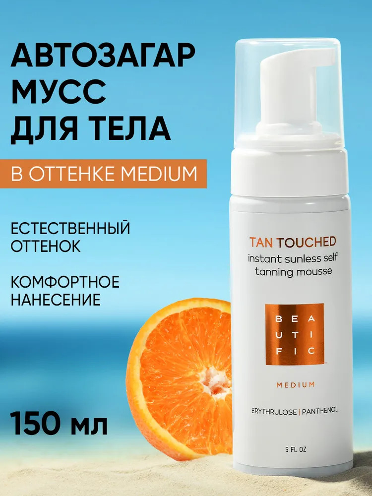 Beautific Мусс-автобронзант для тела «Tan Touched»В данный момент этот товар отсутствует в продаже. Возможно, у нас найдется аналогичный или похожий товар здесь. Автозагар Tan Touched от Beautific — твое идеальное решение для красивого загара круглый год без необходимости посещать солярий и загорать на солнце. Мусс автобронзант обеспечивает моментальный загар без риска появления шелушения или неестественного оттенка кожи. Бронзатор для тела Beautific разработан с учетом потребностей современных женщин и мужчин. Он легко наносится, обеспечивая ровный и интенсивный загар. Входящий в состав пантенол обеспечивает увлажняющий, успокаивающий и разглаживающий эффект. Также мусс можно использовать как бронзер для усиления естественного загара или как жидкие колготки. |