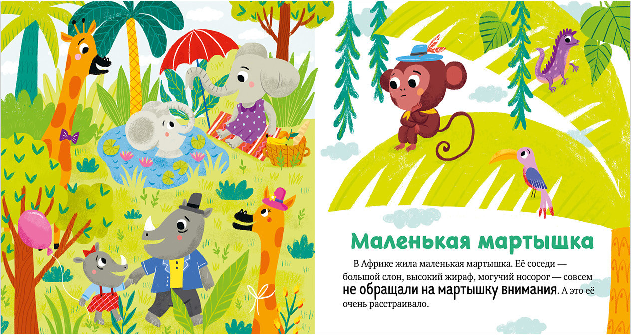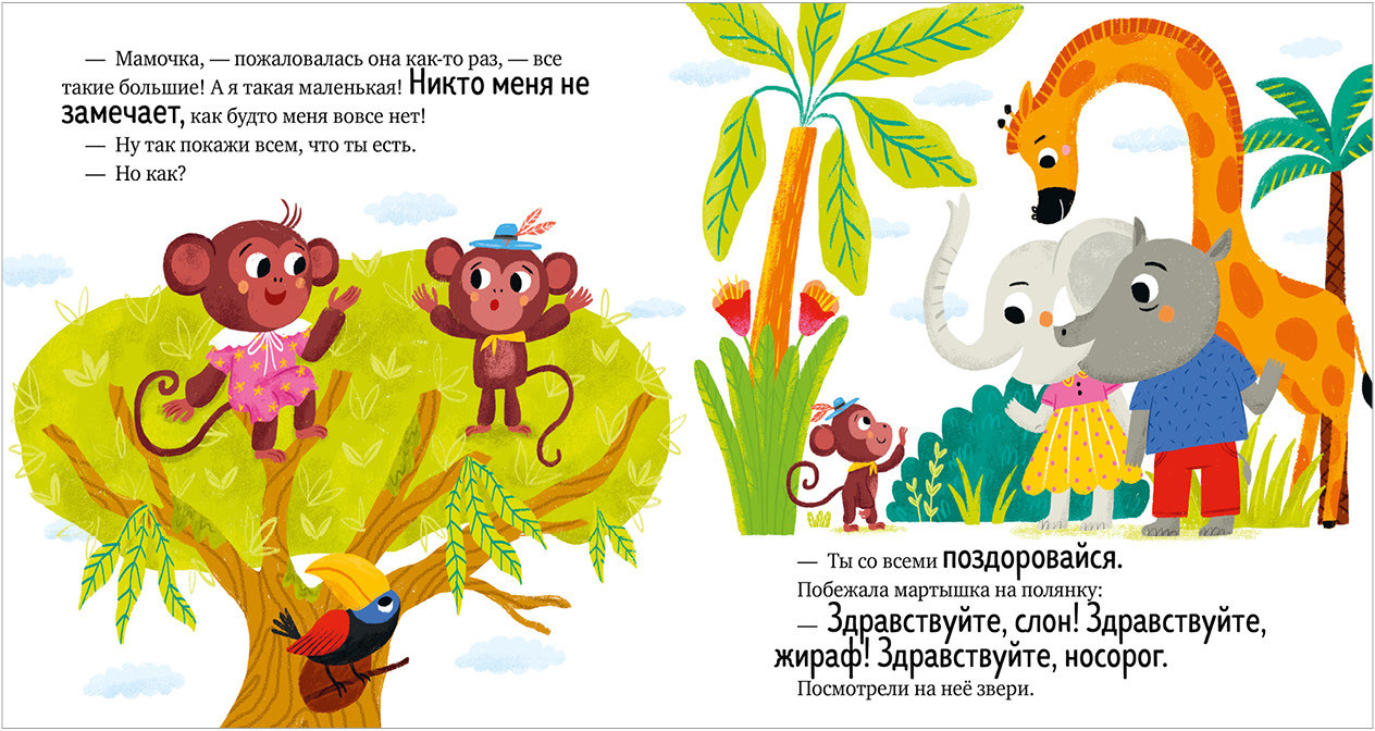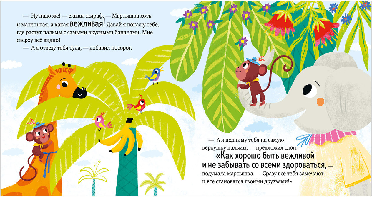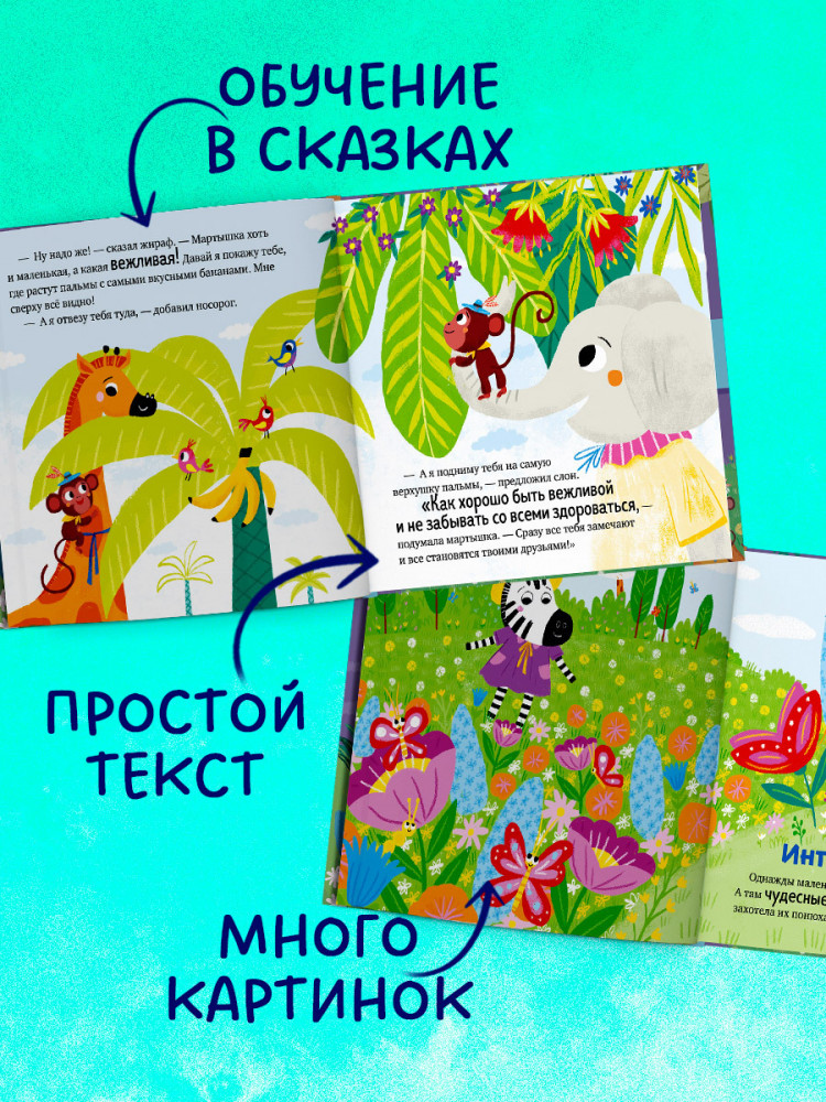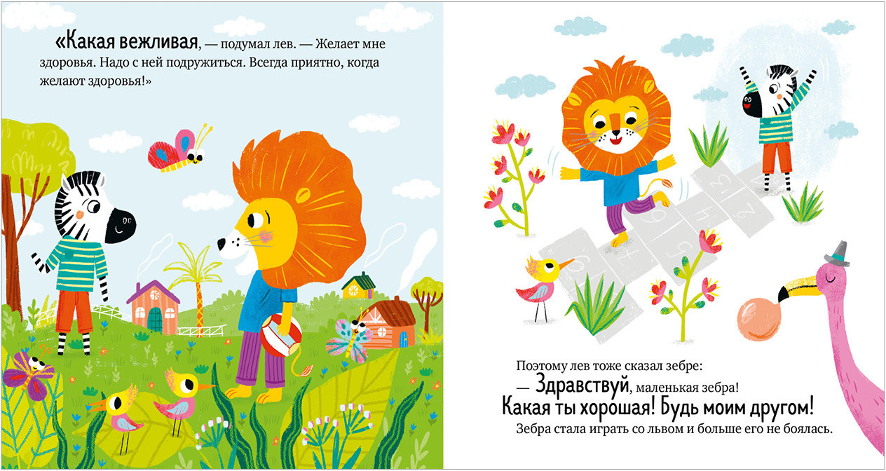 Как зебре удалось подружиться со львом? Мама научила зебру, что нужно поздороваться. «Здравствуйте» — это волшебное слово. Мартышке оно тоже помогло завести друзей. А еще сказки познакомят с такими волшебными словами, как «до свидания», «извините», «спасибо».