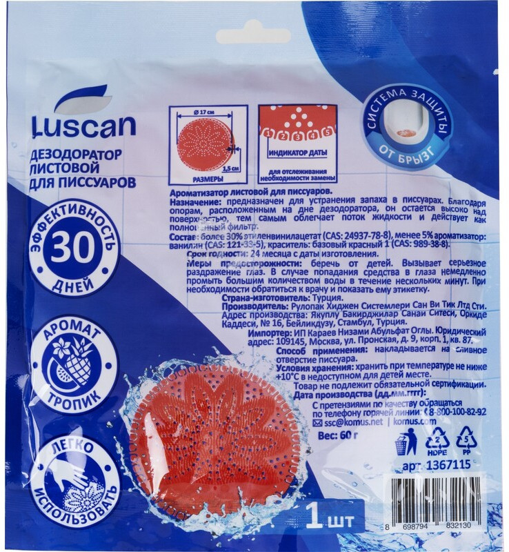 Luscan Дезодоратор для писсуаров листовой «Тропик»