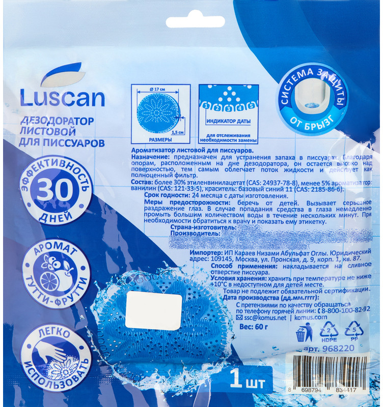 Luscan Дезодоратор для писсуаров листовой «Тутти-фрутти»