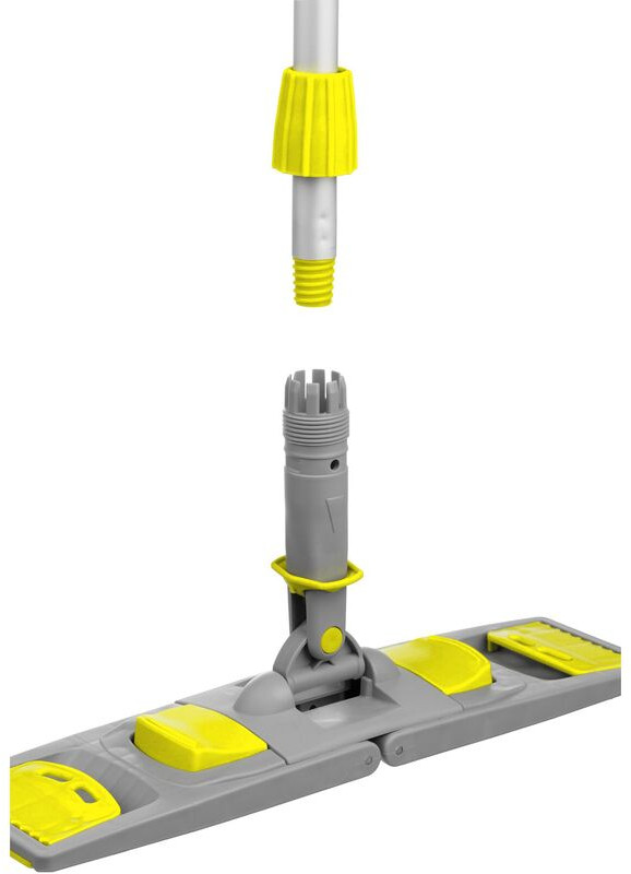 Держатель используется с плоскими мопами. Имеет универсальное крепление мопа, и подходит для мопов как с креплением «карман», так и «ухо». Оснащен шарнирным соединением, обеспечивающим хороший контакт мопа с поверхностью и свободу движений, что позволяет проводить уборку в труднодоступных местах: под витринами, стеллажами, полками, шкафами и прочей мебелью. Механизм складывания: защелка. Имеет цветовую кодировку по стандарту ХАССП, исключая возможность перекрестного загрязнения.