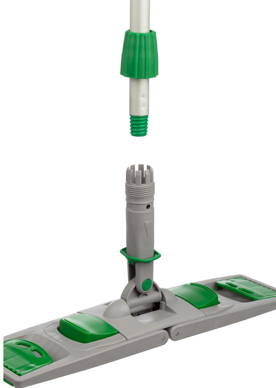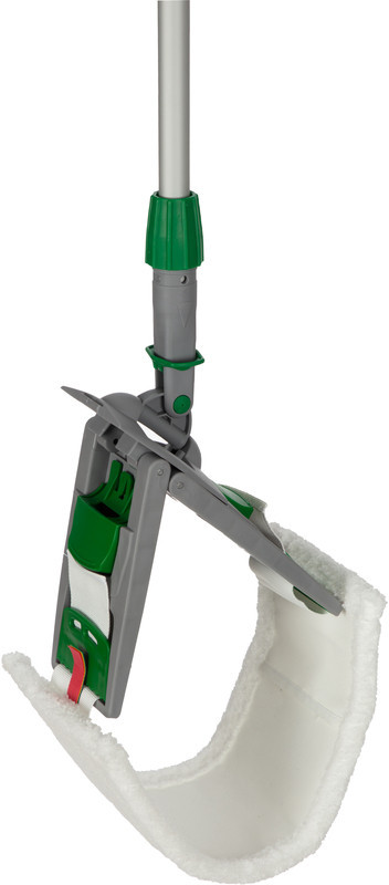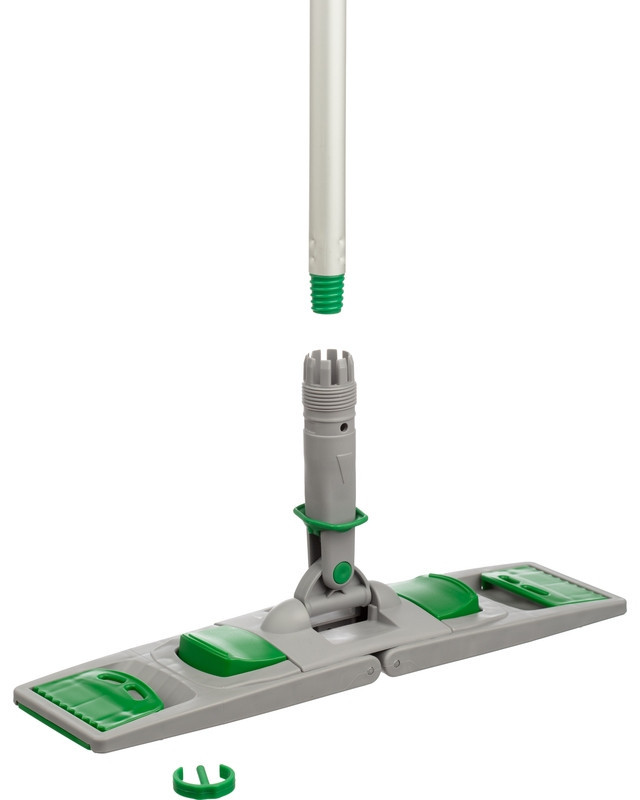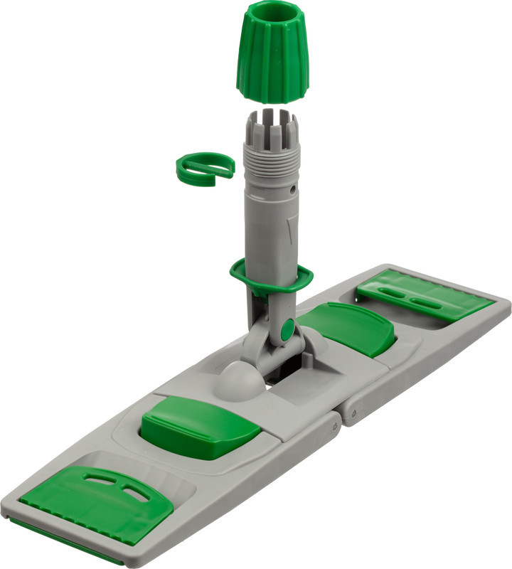 Держатель используется с плоскими мопами. Имеет универсальное крепление мопа, и подходит для мопов как с креплением «карман», так и «ухо». Оснащен шарнирным соединением, обеспечивающим хороший контакт мопа с поверхностью и свободу движений, что позволяет проводить уборку в труднодоступных местах: под витринами, стеллажами, полками, шкафами и прочей мебелью. Механизм складывания: защелка. Имеет цветовую кодировку по стандарту ХАССП, исключая возможность перекрестного загрязнения.