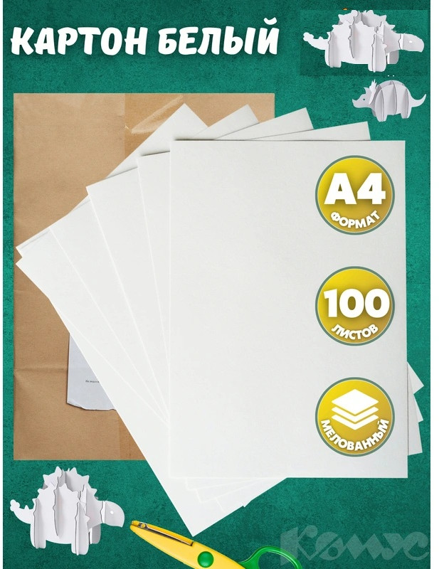 Картон белый мелованный предназначен для детского творчества, подшивки документов. Упаковка из крафт-бумаги содержит 100 листов плотностью 240 г/кв.м с гладкой белой поверхностью с лицевой стороны и с серой поверхностью с оборотной стороны. Размер листов А4.