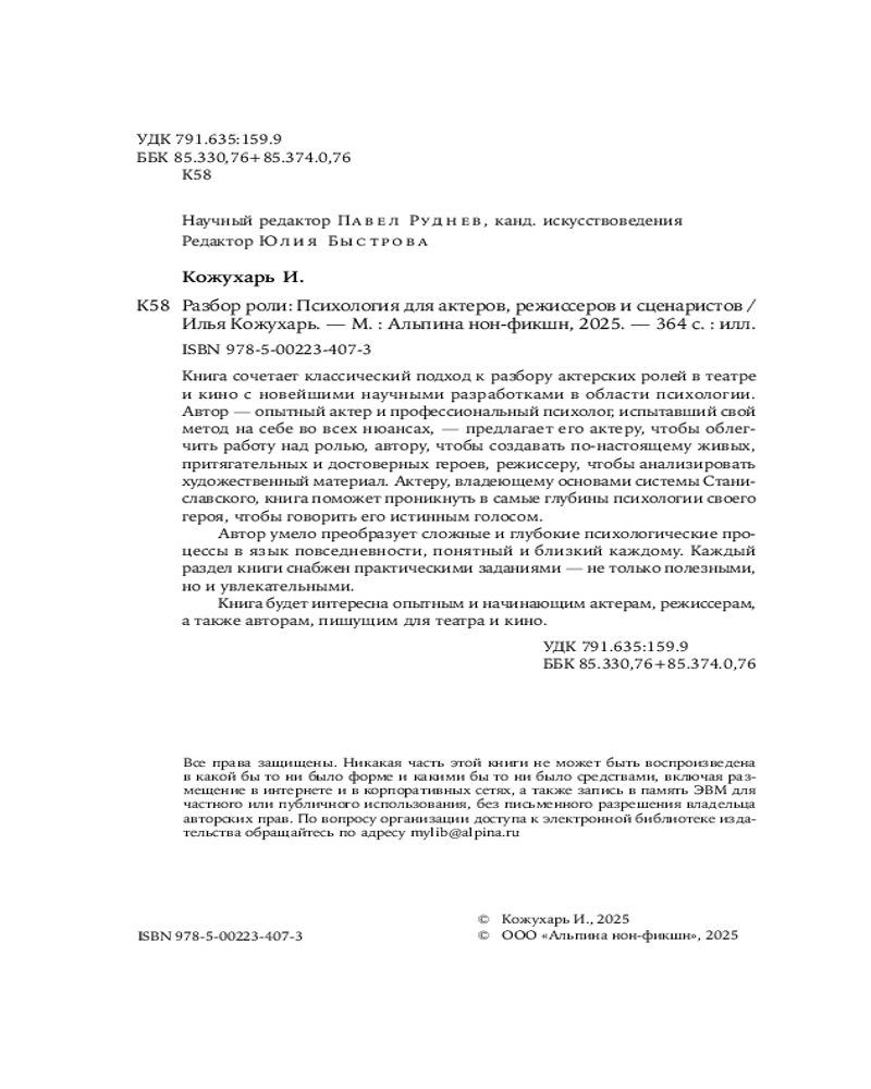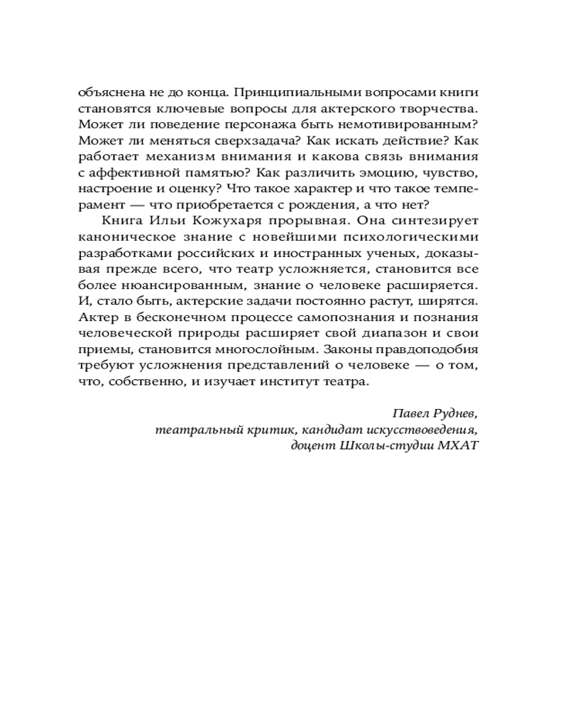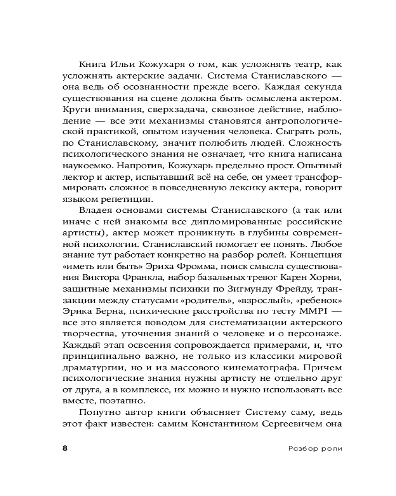 💳 Оплатить за товар можно при получении 🇰🇿 Есть бесплатная доставка по Казахстану от 1 дня 🎁 Копите бонусы с каждой покупки Книга сочетает классический подход к разбору актерских ролей в театре и кино с новейшими научными разработками в области психологии. Автор — опытный актер и профессиональный психолог, испытавший свой метод на себе во всех нюансах, — предлагает его актеру, чтобы облегчить работу над ролью, автору, чтобы создавать по-настоящему живых, притягательных и достоверных героев, режиссеру, чтобы анализировать художественный материал. Актеру, владеющему основами системы Станиславского, книга поможет проникнуть в самые глубины психологии своего героя, чтобы говорить его истинным голосом. |