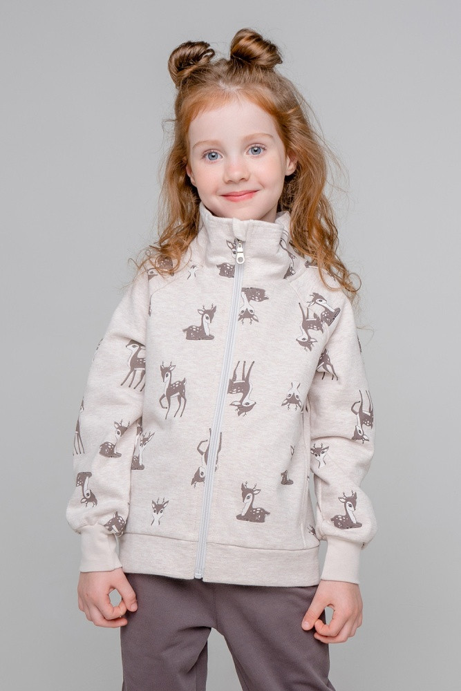 Набивная куртка на молнии для девочки из футера с начёсом, произведенного из натурального хлопка. По низу рукавов-реглан и изделия эластичные манжеты. По бокам карманы. Оригинальная набивка выполнена из стойких текстильных красителей. Куртка сохраняет цвет и форму после многократных стирок.