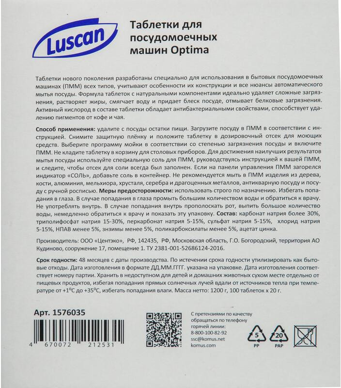 Назначение: таблетки нового поколения Luscan разработаны специально для использования в бытовых посудомоечных машинах всех типов. Формула таблеток с натуральными компонентами идеально удаляет сложные загрязнения, растворяет жиры, отмывает белковые загрязнения как при коротких циклах мойки, так и при длинных. Активный кислород в составе таблетки обладает антибактериальными свойствами, способствует удалению пигментов от кофе и чая. Таблетки полностью смываются водой, не оставляя разводов на посуде. Таблетки способствуют смягчению воды и препятствуют образованию накипи.