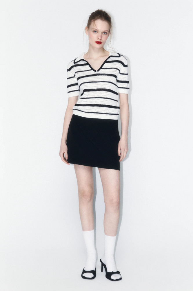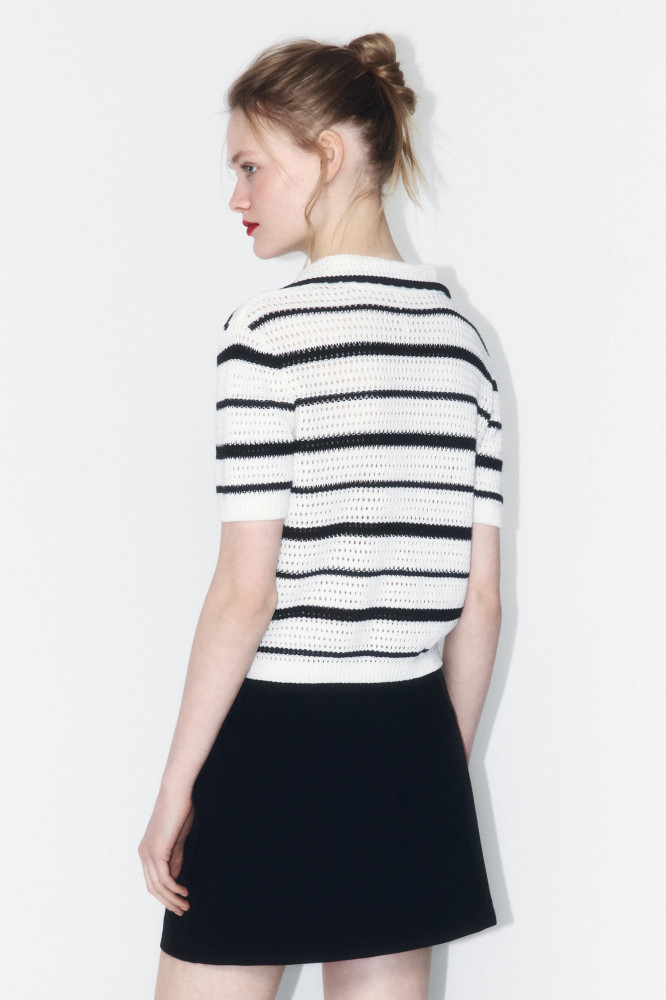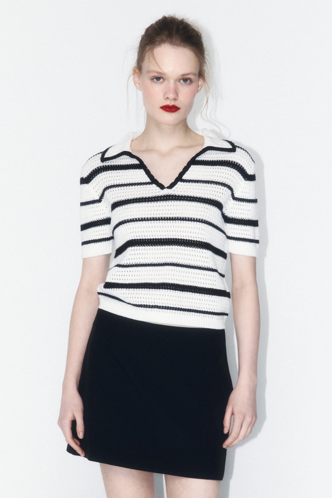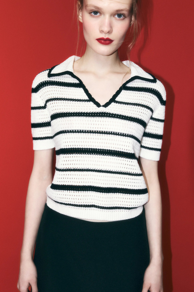 Женский джемпер-поло свободного кроя из полупрозрачной ажурной 100% хлопковой ткани. Отложной рубашечный воротник с V-образным вырезом. Короткие рукава с прямыми манжетами в рубчик и слегка спущенной линией плеча. Прямой нижний край в рубчик без разрезов и декоративных элементов. Соблазнительный ажурный джемпер в полоску позволит создать образы в самых разных стилях. Сочетай его с классическим, повседневным или гранж-низом и создавай яркие, женственные и привлекательные аутфиты, в которых ты точно не останешься незамеченной. Ажурный вязаный джемпер-поло отлично будет сочетаться с вещами из кожи или денима. Отличный вариант основы аутфитов на прогулки, вечеринки, концерты и просто на каждый день. Носи его отдельно или в составе многослойных образов в зависимости от твоего настроения.
