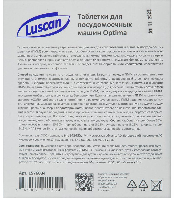 Назначение: таблетки нового поколения Luscan разработаны специально для использования в бытовых посудомоечных машинах всех типов. Формула таблеток с натуральными компонентами идеально удаляет сложные загрязнения, растворяет жиры, отмывает белковые загрязнения как при коротких циклах мойки, так и при длинных. Активный кислород в составе таблетки обладает антибактериальными свойствами, способствует удалению пигментов от кофе и чая. Таблетки полностью смываются водой, не оставляя разводов на посуде. Таблетки способствуют смягчению воды и препятствуют образованию накипи.