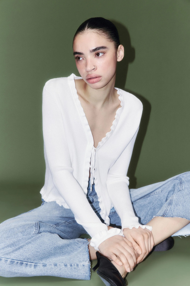 Женский укороченный кардиган полуприлегающего кроя из мягкой ткани тонкой вязки с добавлением вискозы. V-образные вырез горловины. Длинные облегающие рукава с волнистыми манжетами и слегка спущенной линией плеча. Застежка на завязку спереди. Отделка оборками. Универсальный и удобный укороченный кардиган на завязках станет универсальной вещью гардероба и основой разных образов. Надевай кардиган с оборками на свидания, сочетая его с атласными комбинациями. Кардиган без принта станет основой расслабленных повседневных образов и разбавит строгие образы на учебу или в офис. Носи его отдельно или в составе многослойных образов.