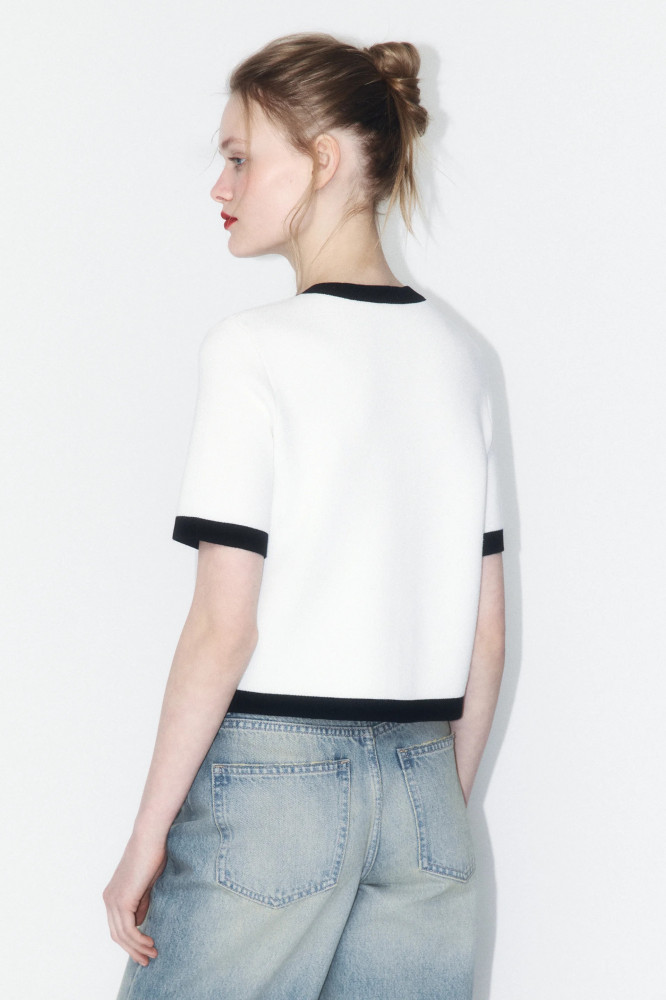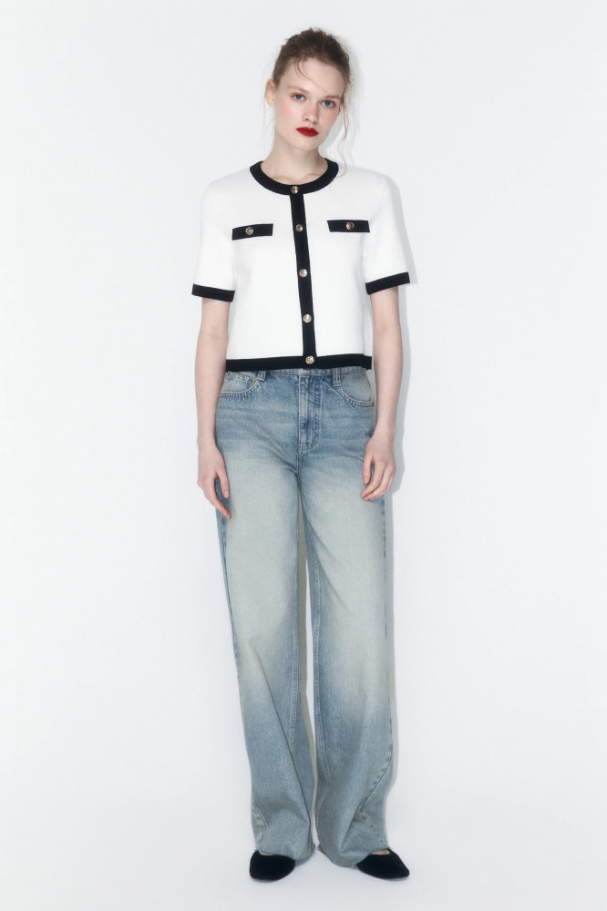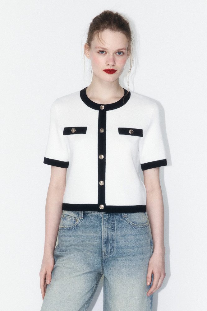 Укороченный женский вязаный кардиган полуприлегающего кроя из мягкой, приятной к телу ткани толстой вязки с жаккардовой фактурой. Круглый вырез горловины без воротника. Короткие свободные рукава с эластичными манжетами, прямая линия плеча. Застежка на крупные золотистые пуговицы спереди. Имитация карманов с застежкой на пуговицы на груди. Из трендов никогда не уйдет женственность, а вещи в стиле французской богемы точно не оставят тебя без внимания. Укороченный вязаный жакет на пуговицах окутает тебя флером Chanel. Носи его отдельно или сочетай с любыми топами или блузками и создавай расслабленные повседневные, школьные, университетские и офисные луки, в которых тебе будет максимально комфортно. Стильный вязаный кардиган-жакет с короткими рукавами станет основой твоего гардероба и идеально подойдет на любой сезон и любую погоду.