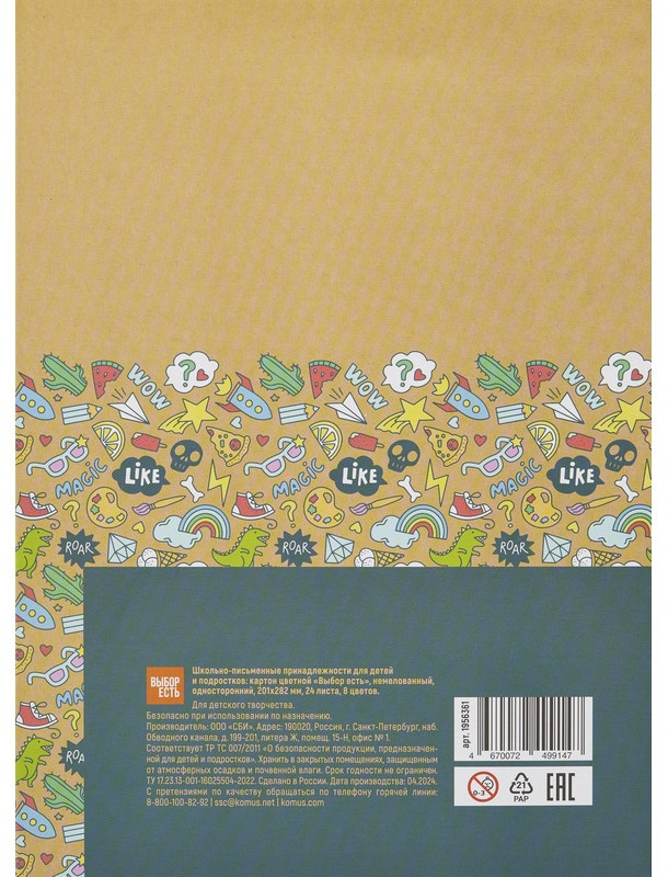 💳 Оплатить за товар можно при получении 🇰🇿 Есть бесплатная доставка по Казахстану от 1 дня 🎁 Копите бонусы с каждой покупки Набор включает 24 листа яркого, плотного, удобного в работе картона — настоящий простор для реализации творческих идей вашего ребенка! Листы формата А4 (201×282 мм) — удобный размер для любых творческих задумок. 8 насыщенных цветов: черный, белый, желтый, зеленый, красный, оранжевый, коричневый, синий — по 3 листа каждого цвета. Немелованная поверхность: приятная на ощупь фактура картона идеально подходит для рисования, аппликаций и создания поделок. Оптимальная плотность: 190-220 грамм на квадратный метр — достаточно плотный для создания объемных конструкций, но при этом удобный для работы с ножницами. Удобная картонная папка: пригодится для хранения и защиты листов от повреждений. Универсальный набор — подходит для самых разных видов детского творчества. Яркие, насыщенные цвета вдохновляют на создание красочных работ. А доступная цена делает этот набор отличным выбором для родителей и педагогов. |