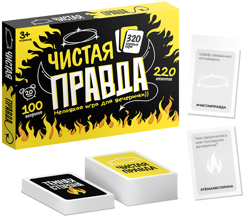 Настольная игра «Чистая правда» для взрослых - игра, которая превратит вашу вечеринку в эпичный вечер смеха и незабываемых моментов! Создавайте самые смешные, оригинальные или неожиданные ответы на вопросы или утверждения. Рекомендованный возраст игроков от 18 лет. |