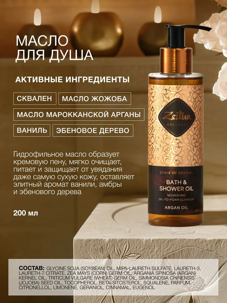 Масло для душа: glycine soja (soybean) oil, mipa-laureth sulfate, laureth-3, laureth-7 citrate, zea mays (corn) germ oil, argania spinosa (argan) kernel oil, triticum vulgare (wheat) germ oil, simmondsia сhinensis (jojoba) seed oil, tocopherol, beta-sitosterol, squalene, parfum, citronellol, limonene, geraniol, cinnamal, eugenol.