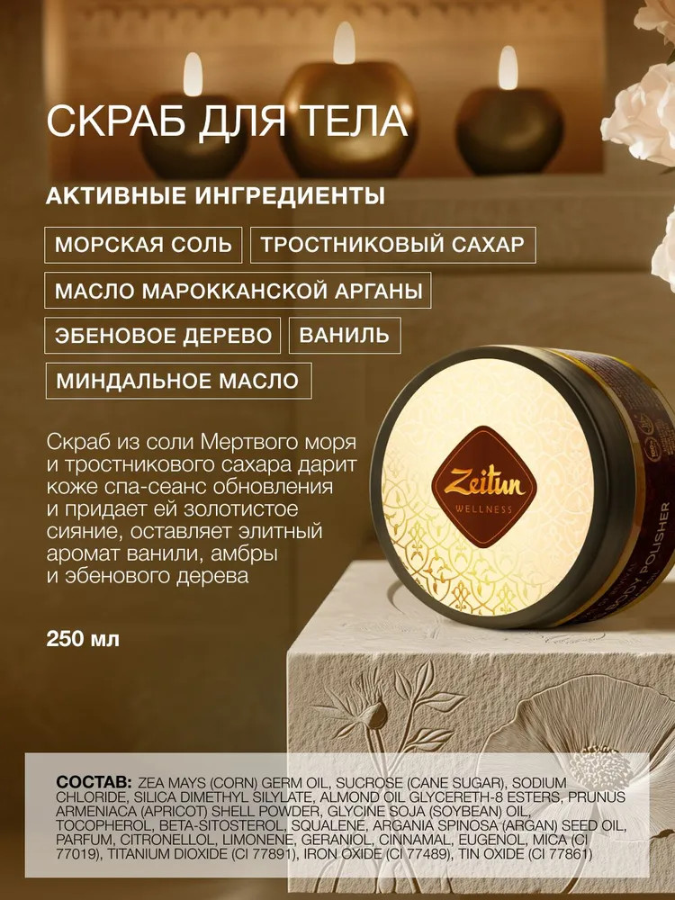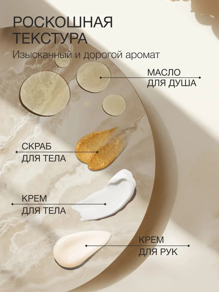 Скраб для тела: aqua, butyrospermum parkii, butter, cetearyl alcohol, prunus armeniaca (apricot) seed powder, glycerin, macadamia ternifolia seed oil, hydroxyethyl urea, propyl heptyl caprylate, potassium cetyl phosphate, zea mays (corn) germ oil, allantoin, prunus amygdalus dulcis (sweet almond) oil, vegetable oil, hydrogenated ethylhexyl olivate, hydrogenated olive oil unsaponifiables, tocopherol, beta-sitosterol, squalene, chamomilla recutita flower extract, pumice, xanthan gum, sodium lauroyl glutamate, sodium stearoyl lactylate, prunus amygdalus amara (bitter almond) kernel oil, tetrasodium glutamate diacetate, ethylhexylglycerin, phenoxyethanol, parfum, limonene.