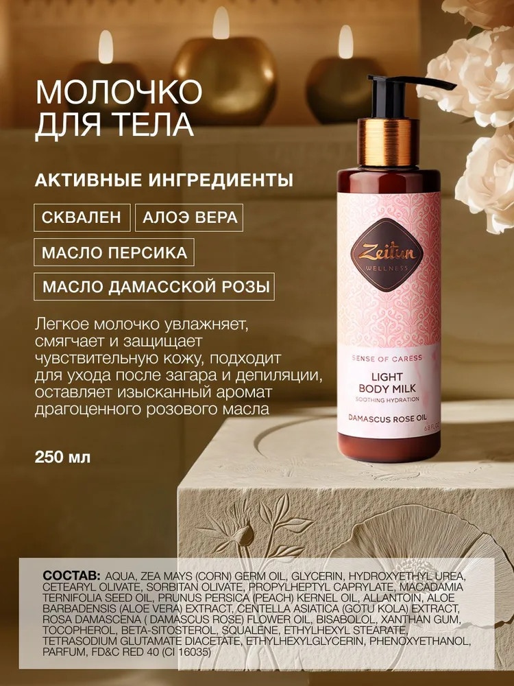 Молочко для тела: Aqua, Zea Mays (Corn) Germ Oil, Glycerin, Hydroxyethyl Urea, Cetearyl Olivate, Sorbitan Olivate, Propylheptyl Caprylate, Macadamia Ternifolia Seed Oil, Prunus Persica (Peach) Kernel Oil, Allantoin, Aloe Barbadensis (Aloe Vera) Extract, Centella Asiatica (Gotu Kola) Extract, Rosa Damascena ( Damascus Rose) Flower Oil, Bisabolol, Xanthan Gum, Tocopherol, Beta-Sitosterol, Squalene, Ethylhexyl Stearate, Tetrasodium Glutamate Diacetate, Ethylhexylglycerin, Phenoxyethanol, Parfum, Fd&C Red 40 (CI 16035).