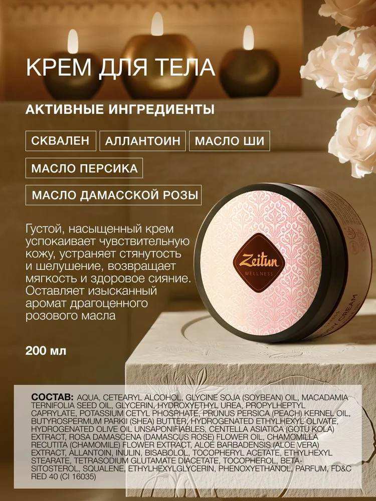 Крем для тела: Aqua, Cetearyl Alcohol, Glycine Soja (Soybean) Oil, Macadamia Ternifolia Seed Oil, Glycerin, Hydroxyethyl Urea, Propylheptyl Caprylate, Potassium Cetyl Phosphate, Prunus Persica (Peach) Kernel Oil, Butyrospermum Parkii (Shea) Butter, Hydrogenated Ethylhexyl Olivate, Hydrogenated Olive Oil Unsaponifiables, Centella Asiatica (Gotu Kola) Extract, Rosa Damascena (Damascus Rose) Flower Oil, Chamomilla Recutita (Chamomile) Flower Extract, Aloe Barbadensis (Aloe Vera) Extract, Allantoin, Inulin, Bisabolol, Tocopheryl Acetate, Ethylhexyl Stearate, Tetrasodium Glutamate Diacetate, Tocopherol, Beta-Sitosterol, Squalene, Ethylhexylglycerin, Phenoxyethanol, Parfum, Fd&C Red 40 (CI 16035).