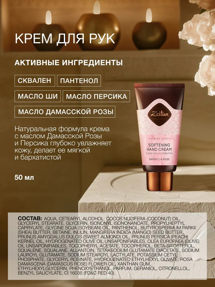 Крем для рук: Aqua, Cetearyl Alcohol, Cocos Nucifera (Coconut) Oil, Glyceryl Stearate, Glycerin, Isononyl Isononanoate, Propylheptyl Caprylate, Glycine Soja (Soybean) Oil, Panthenol, Butyrospermum Parkii (Shea) Butter, Betaine, Inulin, Mangifera Indica (Mango) Seed Butter, Prunus Amygdalus Dulcis (Sweet Almond) Oil, Prunus Persica (Peach) Kernel Oil, Hydrogenated Olive Oil Unsaponifiables, Olea Europaea (Olive) Oil Unsaponifiables, Tocopheryl Acetate, Tocopherol, Beta-sitosterol, Squalene, Squalane, Allantoin, Tetrasodium Glutamate Diacetate, Sodium Lauroyl Glutamate, Sodium Stearoyl Lactylate, Potassium Cetyl Phosphate, Glyceryl Rosinate, Hydrogenated Ethylhexyl Olivate, Rosa Damascena (Damascus Rose) Flower Oil, Xanthan Gum, Ethylhexylglycerin, Phenoxyethanol, Parfum, Geraniol, Citronellol, Benzyl Salicylate, CI 16035 (FD&C Red 40).