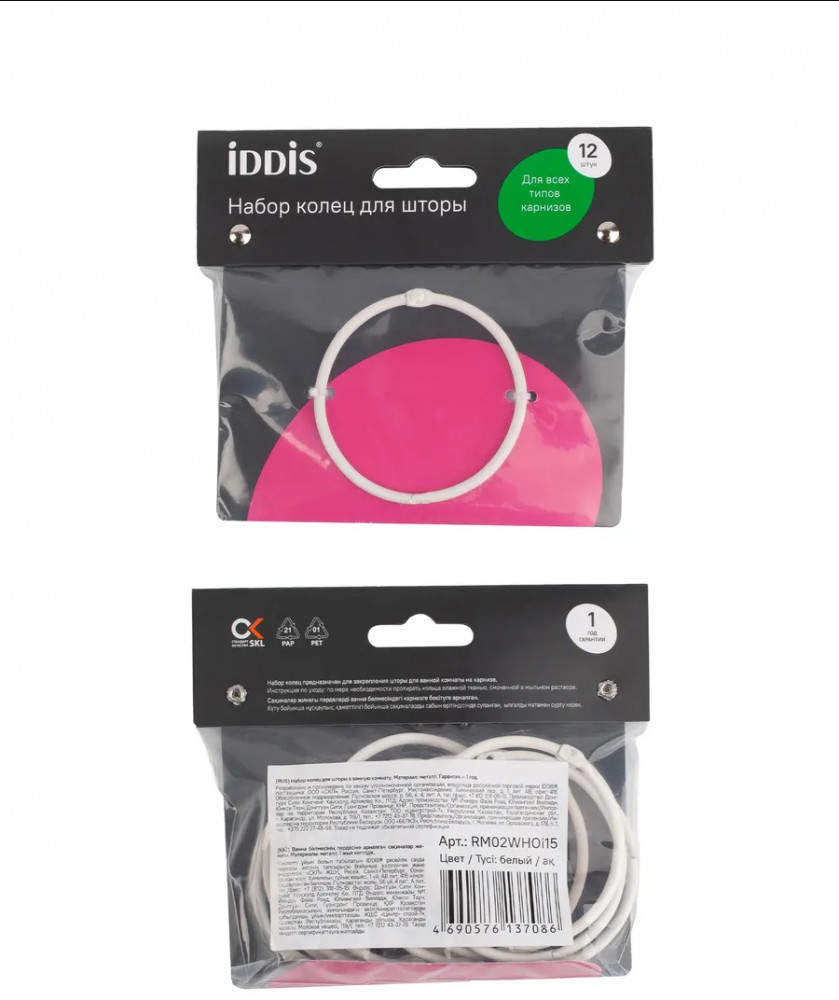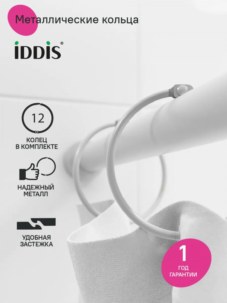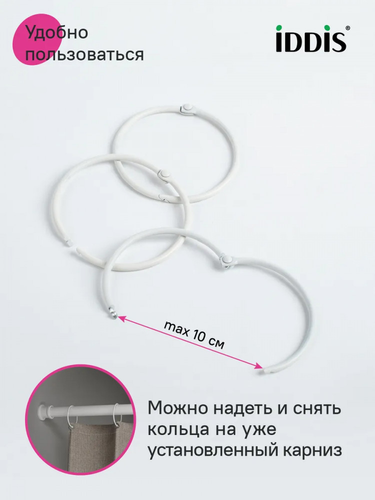 Iddis Набор колец для штор в ванную комнатуВ данный момент этот товар отсутствует в продаже. Возможно, у нас найдется аналогичный или похожий товар здесь. Серия: Elegante Набор колец для шторы в ванную комнату в цвете хром. Долговечность, практичность и красивый внешний вид делают их универсальным решением для оформления интерьера. Изготовлены из прочного металла с надёжным цветным покрытием, обеспечивающим защиту от коррозии. Каждое кольцо имеет внутренний диаметр 53 мм, внешний — 57 мм, что делает их совместимыми с различными карнизами. Кольца оснащены механическим защелкивающимся замком, который обеспечивает их легкое открытие и крепкое надежное закрытие, а также позволяет крепить шторы без необходимости снимать сам карниз. Кольца подходят для штор в любых помещениях дома: гостиной, спальне, на кухне или в ванной. |