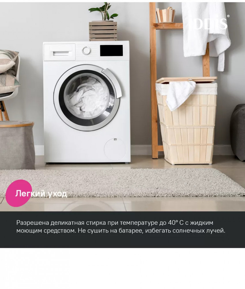 • несложно ухаживать: разрешена деликатная стирка при температуре до 40С с жидким моющим средством; не сушить на батарее, избегать солнечных лучей.