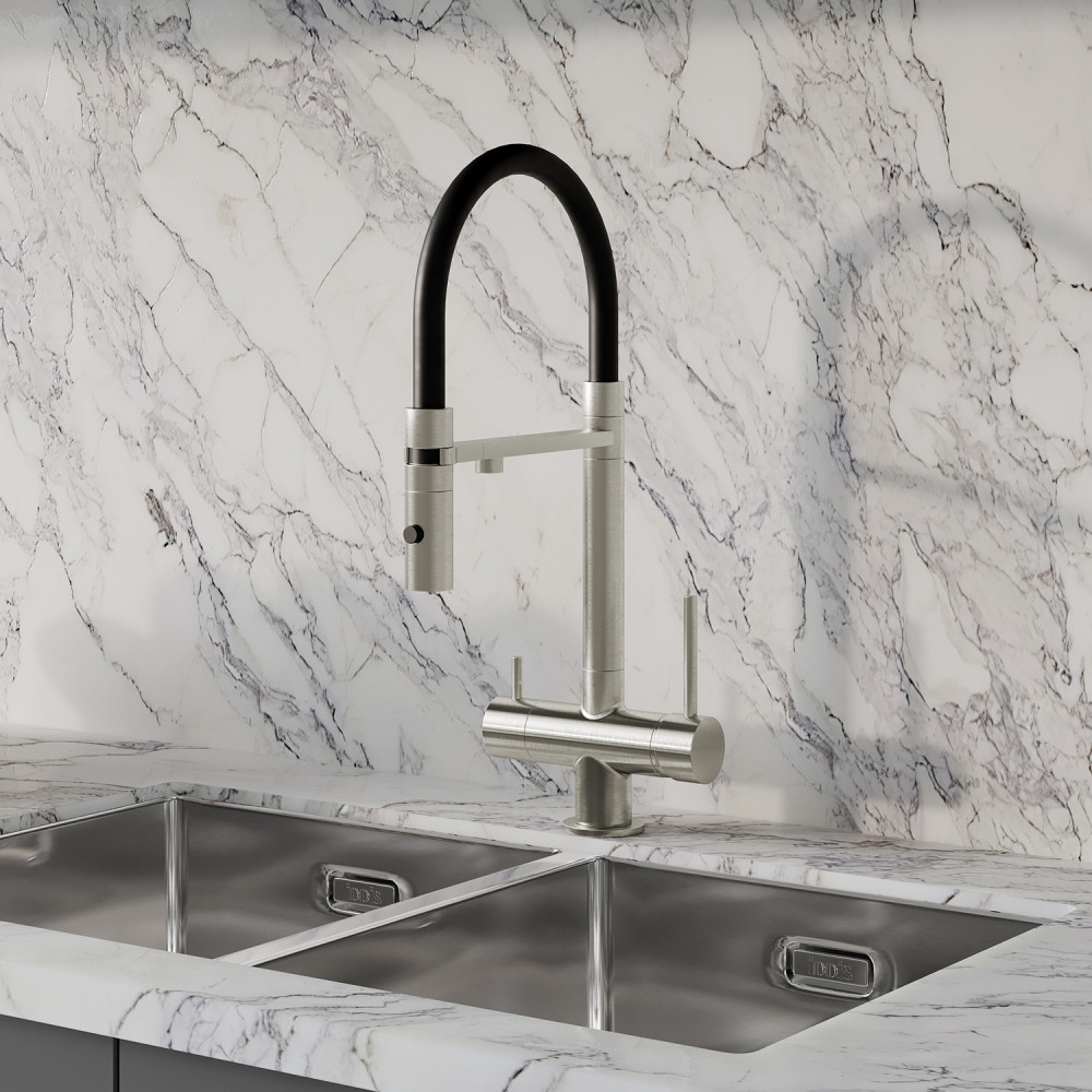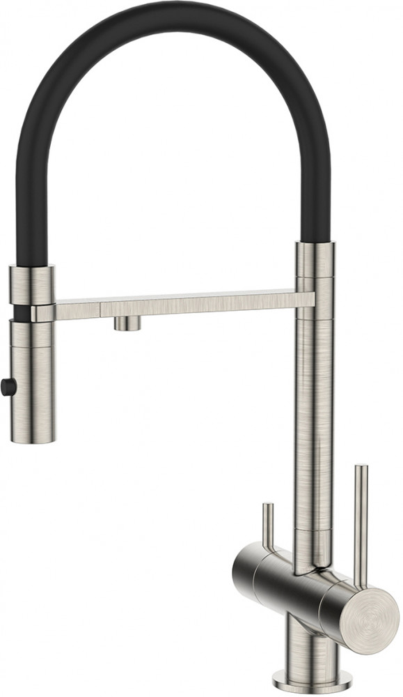 Профессиональный смеситель для кухни Ace в сатиновом оттенке с черным гибким изливом и отдельным каналом для фильтрованной воды. Продуманный и функциональный, он успешно справляется с повседневными задачами на кухне.