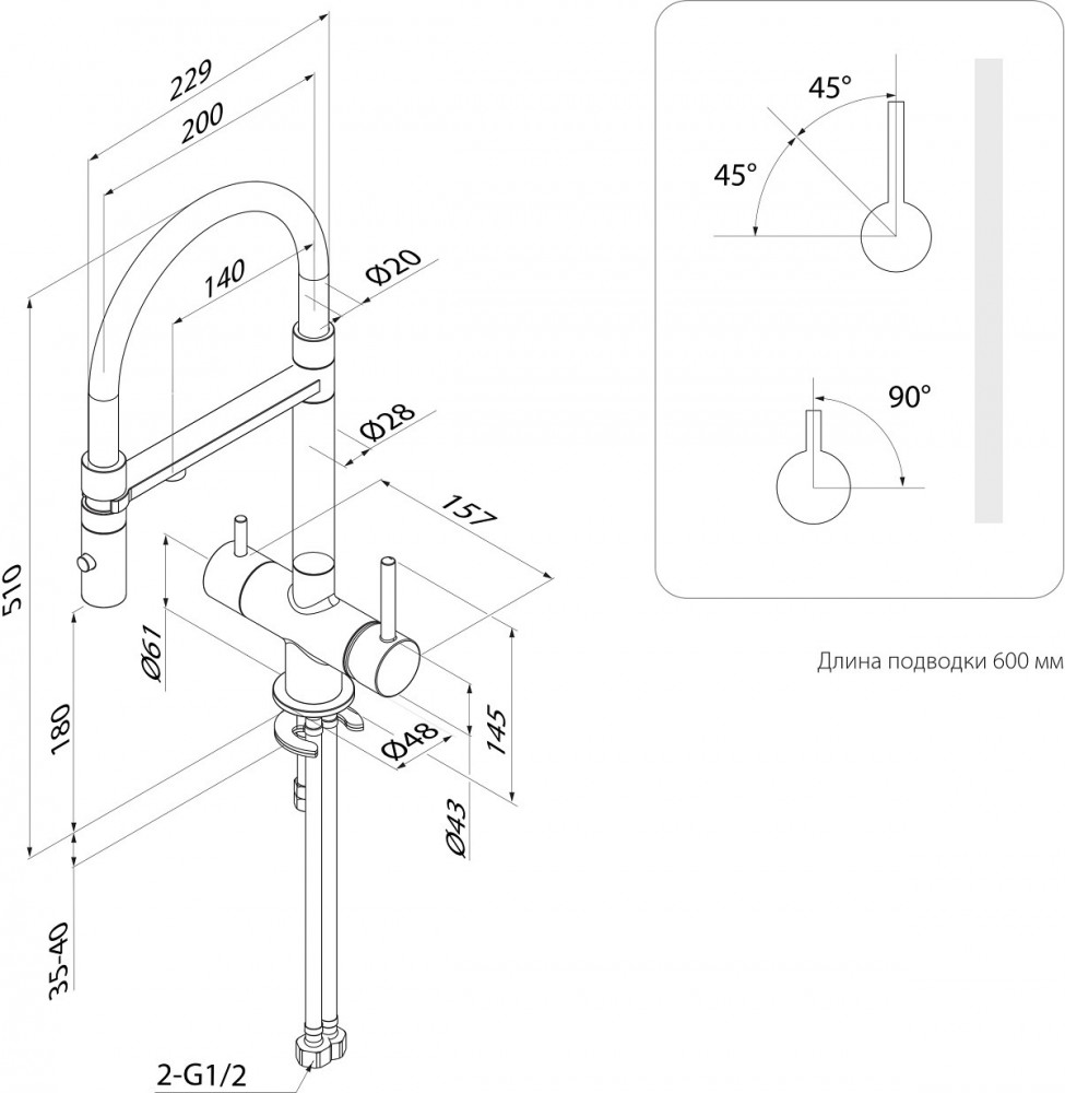 • 2 ручки: для включения фильтрованной воды и для обычной водопроводной (угол открывания ручки — 90 градусов, на себя; может отличаться в зависимости от партии). Фильтр в комплекте не идет и приобретается отдельно;