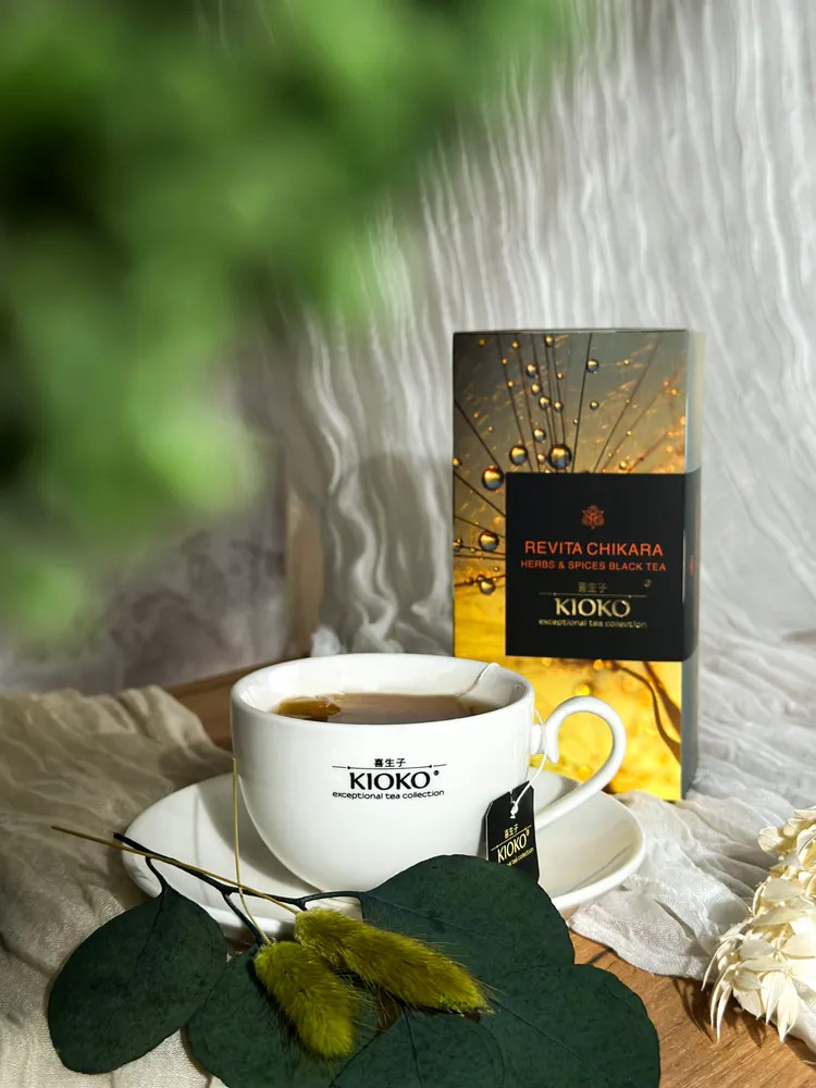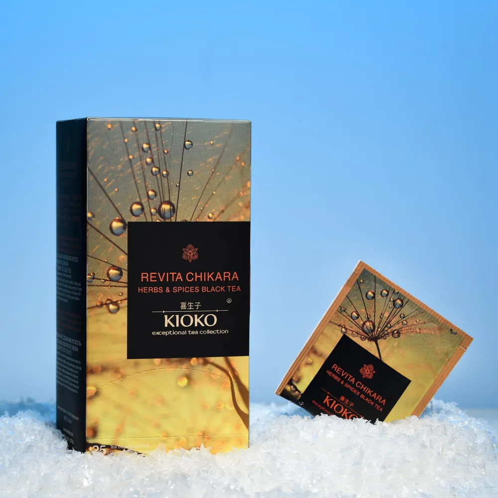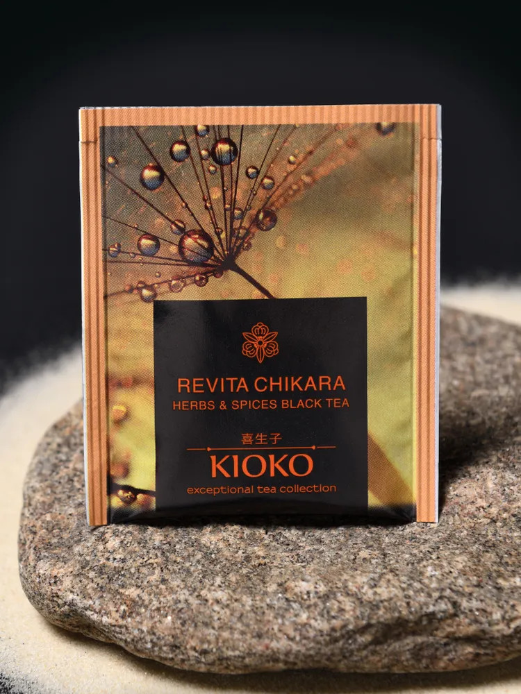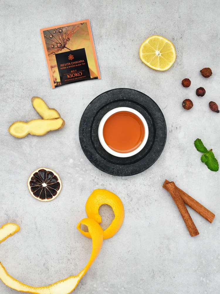 В этой чайной композиции мелодию из ярких нот чёрного чая и душистых трав сопровождают пряные аккорды специй. В богатом букете сплелись пряная сладость, ненавязчивая терпкость и тонкая мятная свежесть. Имя Revita в переводе с японского означает «сила» или «могущество». С незапамятных времён наши предки пользовались силой даров природы, передавая свои знания о них из поколения в поколение. Различные части растений, будь то листья, плоды, корни или почки, обладают характерными ароматами, которые влияют на общую вкусовую гармонию. С помощью трав и специй можно не только добавить изюминку в напиток или блюдо, но и насытить организм полезными для здоровья элементами. Имбирь тонизирует, улучшает пищеварение и ускоряет обмен веществ. Шиповник и мелисса — также отличные тонизирующие средства, способствующие быстрому восстановлению сил. Лемонграсс с его травянисто-цитрусовым ароматом улучшает метаболизм, выводит токсины, помогает бороться с переутомлением и бессонницей. Кроме эфирных масел, он содержит витамины B и С, а также минералы и жирные кислоты. Цедра апельсина предупреждает развитие авитаминоза, поддерживает сердечно-сосудистую систему и снижает уровень холестерина в крови.