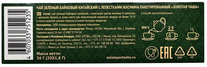 Золотая чаша Чай зелёный байховый китайский с лепестками жасмина