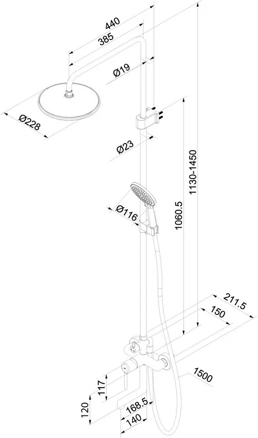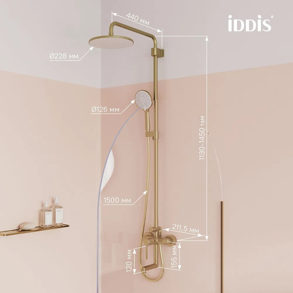 • штанга верхнего душа регулируется по высоте 113–145 см в момент установки смесителя, что позволяет в дальнейшем с комфортом принимать душ всей семье;