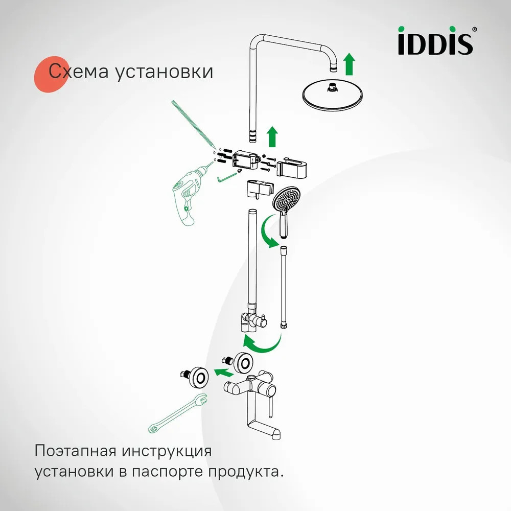 • в комплекте гибкий шланг из ПВХ 1,5 м, верхняя (d = 228 мм) и ручная (3 режима, d = 116 мм) лейки из коллекции Optima Home в тон;