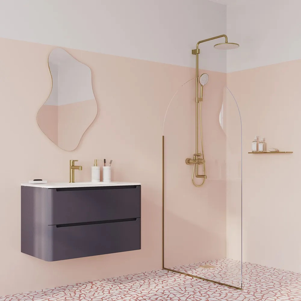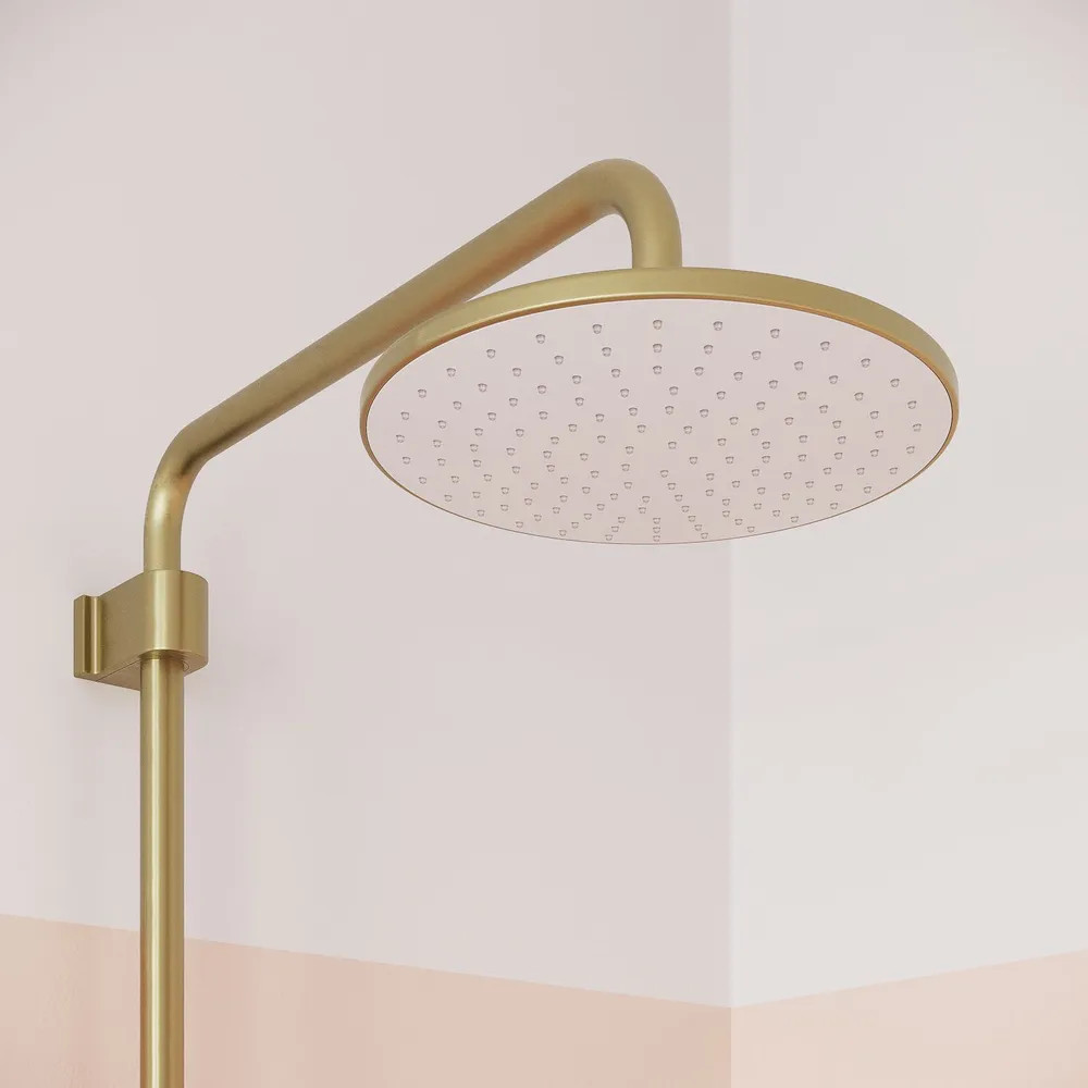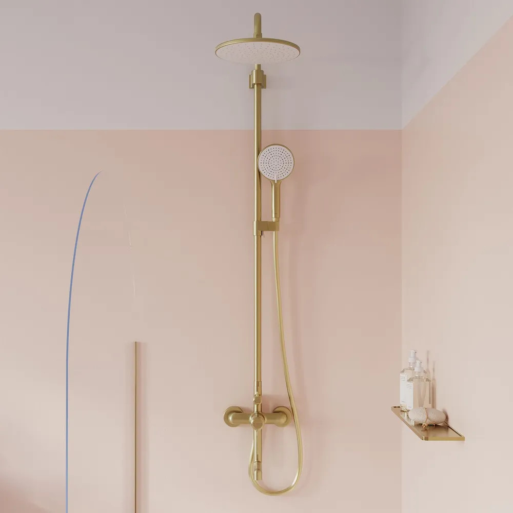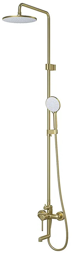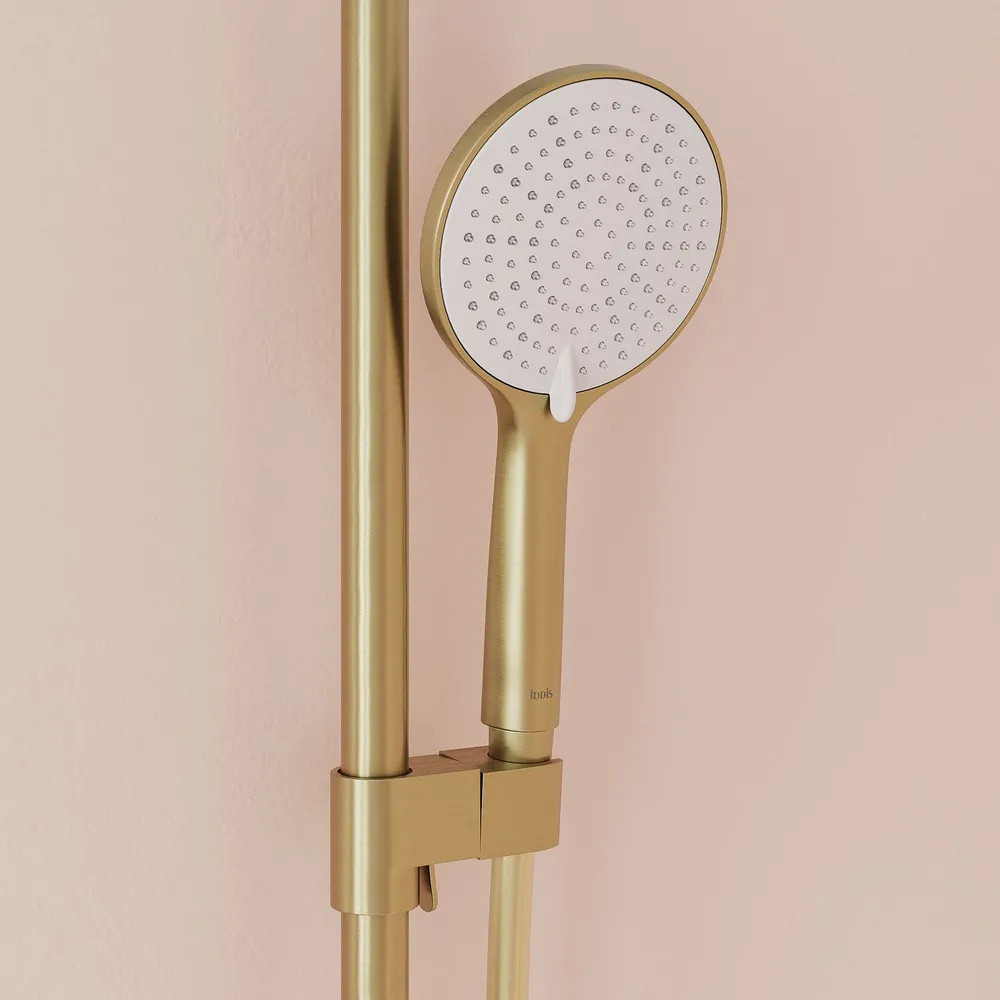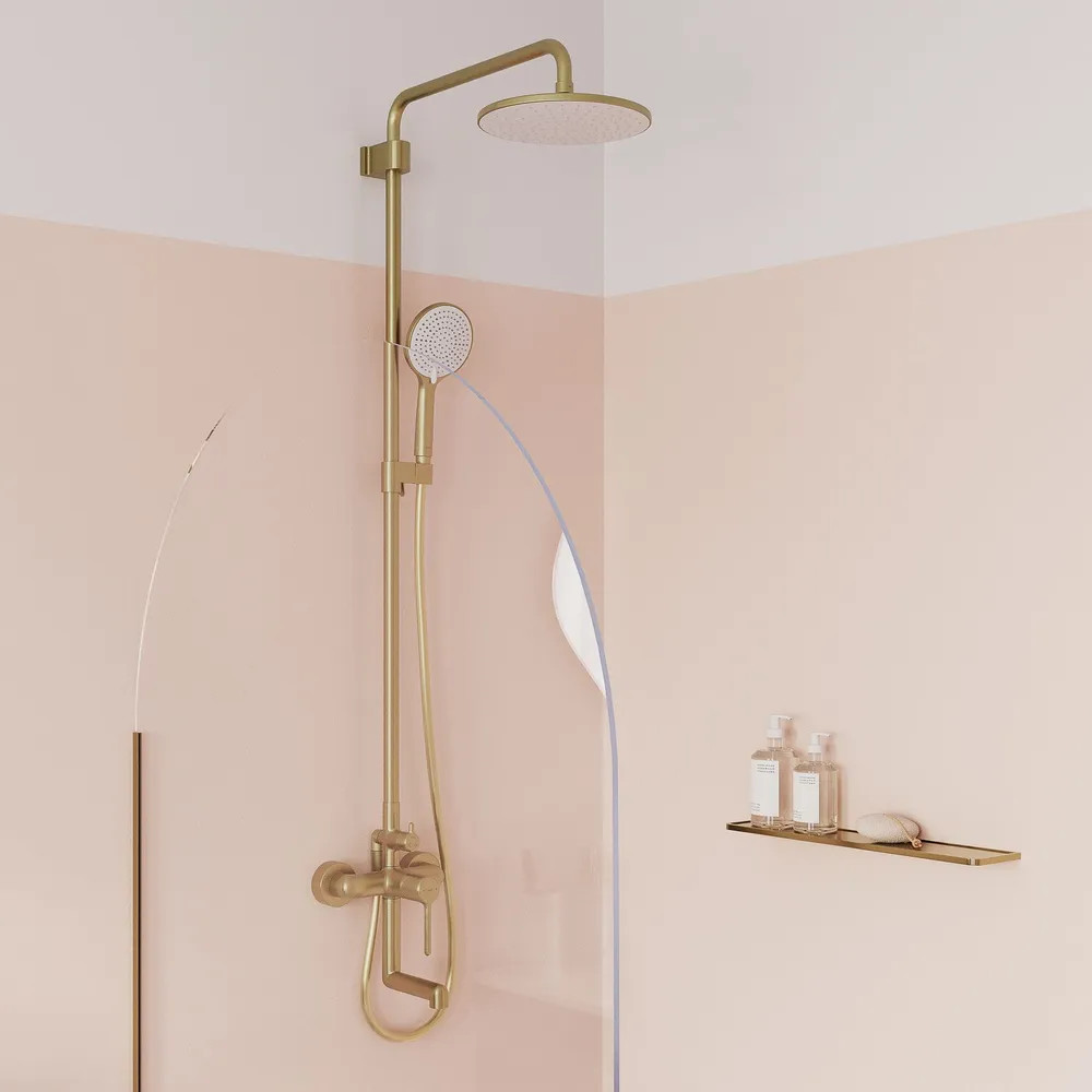 Стильная функциональная душевая система Aiger, где удачно сочетается актуальный современный дизайн и трендовый оттенок матового золота с брашированным покрытием. Тонкая удлиненная ручка добавляет смесителю изящества и комфорт в управлении.