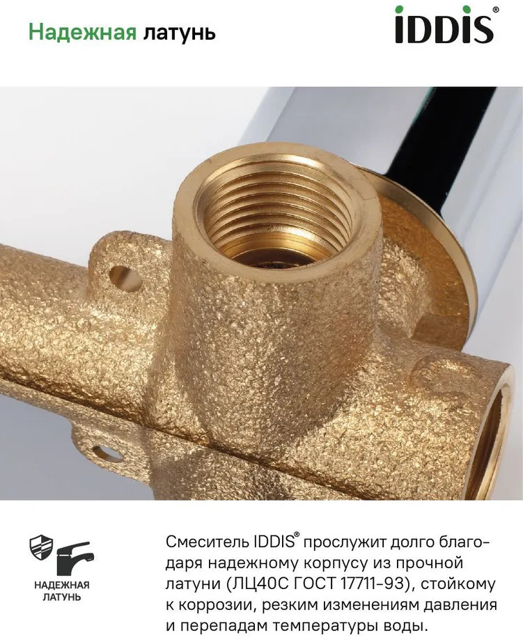 • смеситель прослужит долго благодаря надежному корпусу из прочной латуни, стойкому к коррозии, резким изменениям давления и перепадам температуры воды;