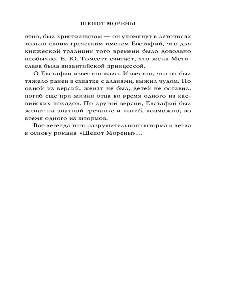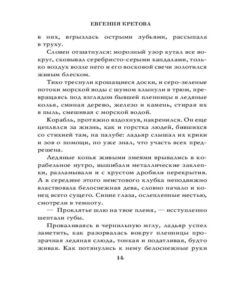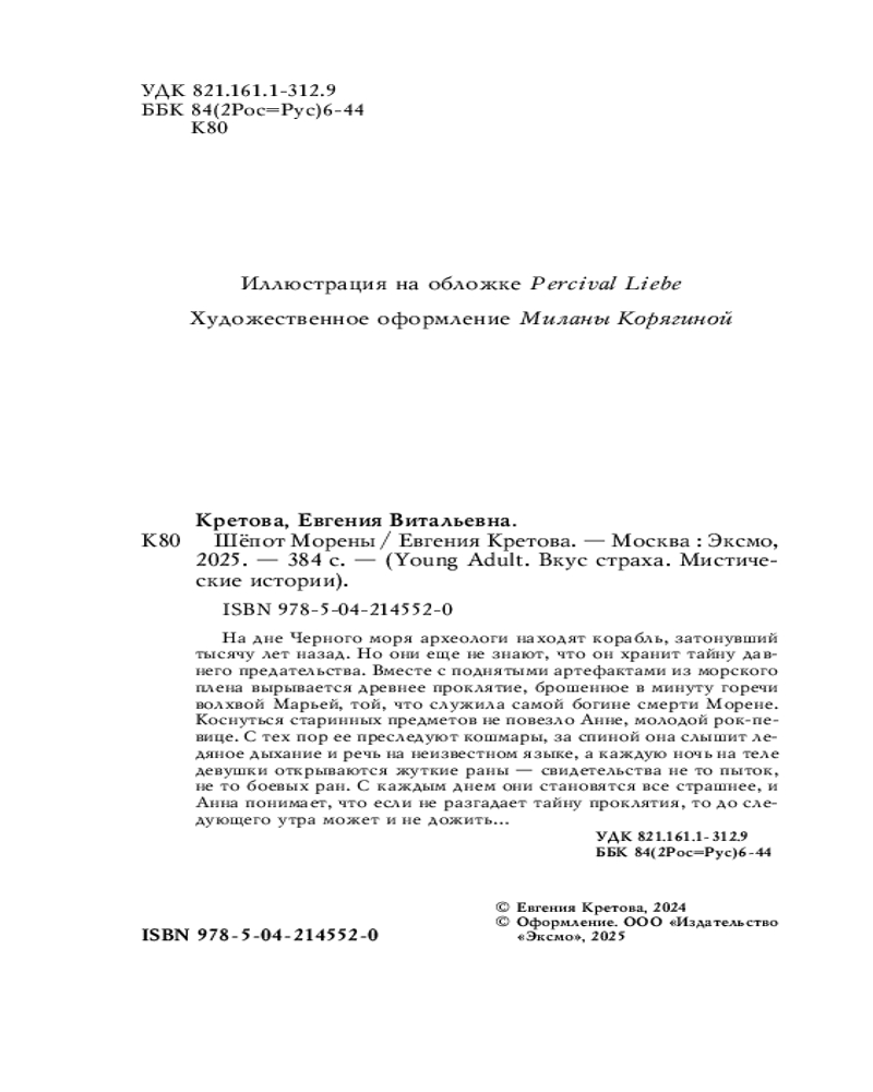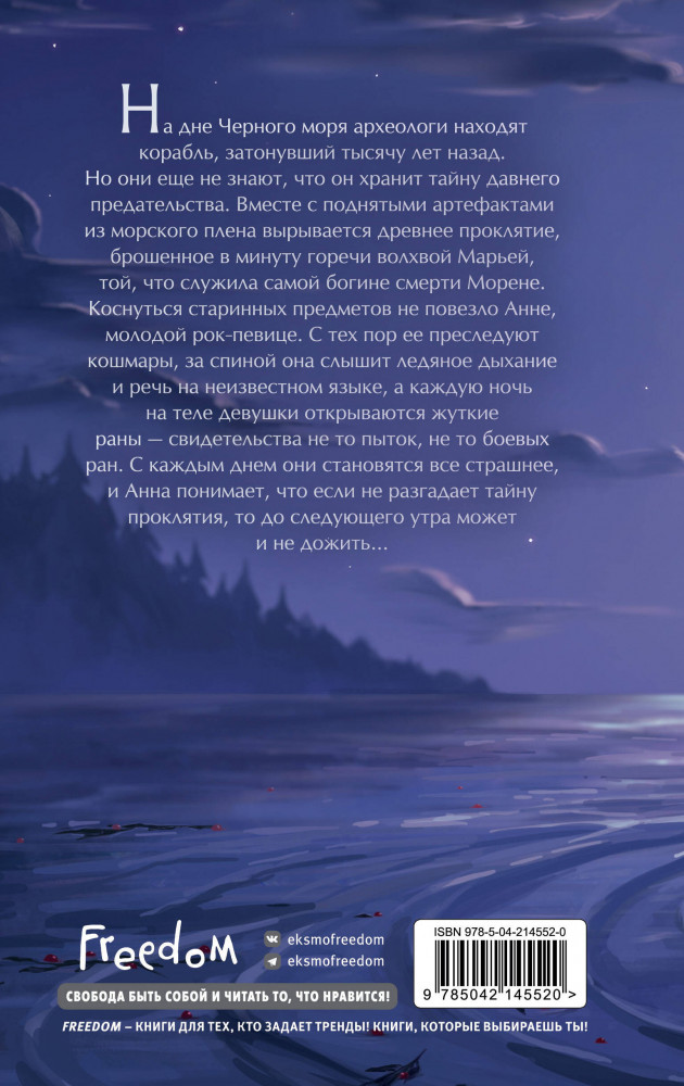 Серия: Young Adult. Вкус страха. Мистические истории На дне Черного моря археологи находят корабль, затонувший тысячу лет назад. Но они еще не знают, что он хранит тайну давнего предательства. Вместе с поднятыми артефактами из морского плена вырывается древнее проклятие, брошенное в минуту горечи волхвой Марьей, той, что служила самой богине смерти Морене. Коснуться старинных предметов не повезло Анне, молодой рок-певице. С тех пор ее преследуют кошмары, за спиной она слышит ледяное дыхание и речь на неизвестном языке, а каждую ночь на теле девушки открываются жуткие раны — свидетельства не то пыток, не то боевых ран. С каждым днем они становятся все страшнее, и Анна понимает, что если не разгадает тайну проклятия, то до следующего утра может и не дожить... Для поклонников романов Татьяны Мастрюковой и Влада Райбера! |