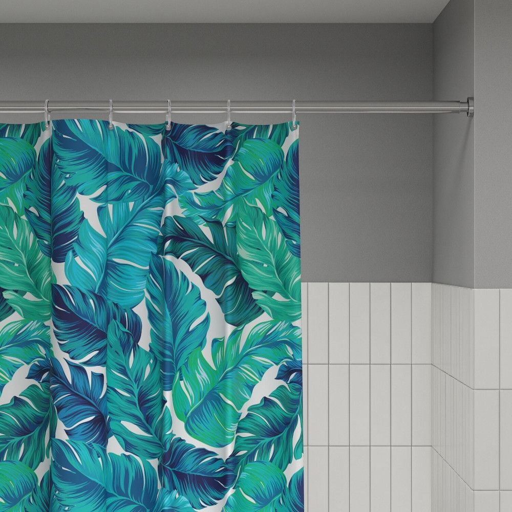 Текстильная штора для ванной белого цвета с ярким разноцветным растительным принтом.